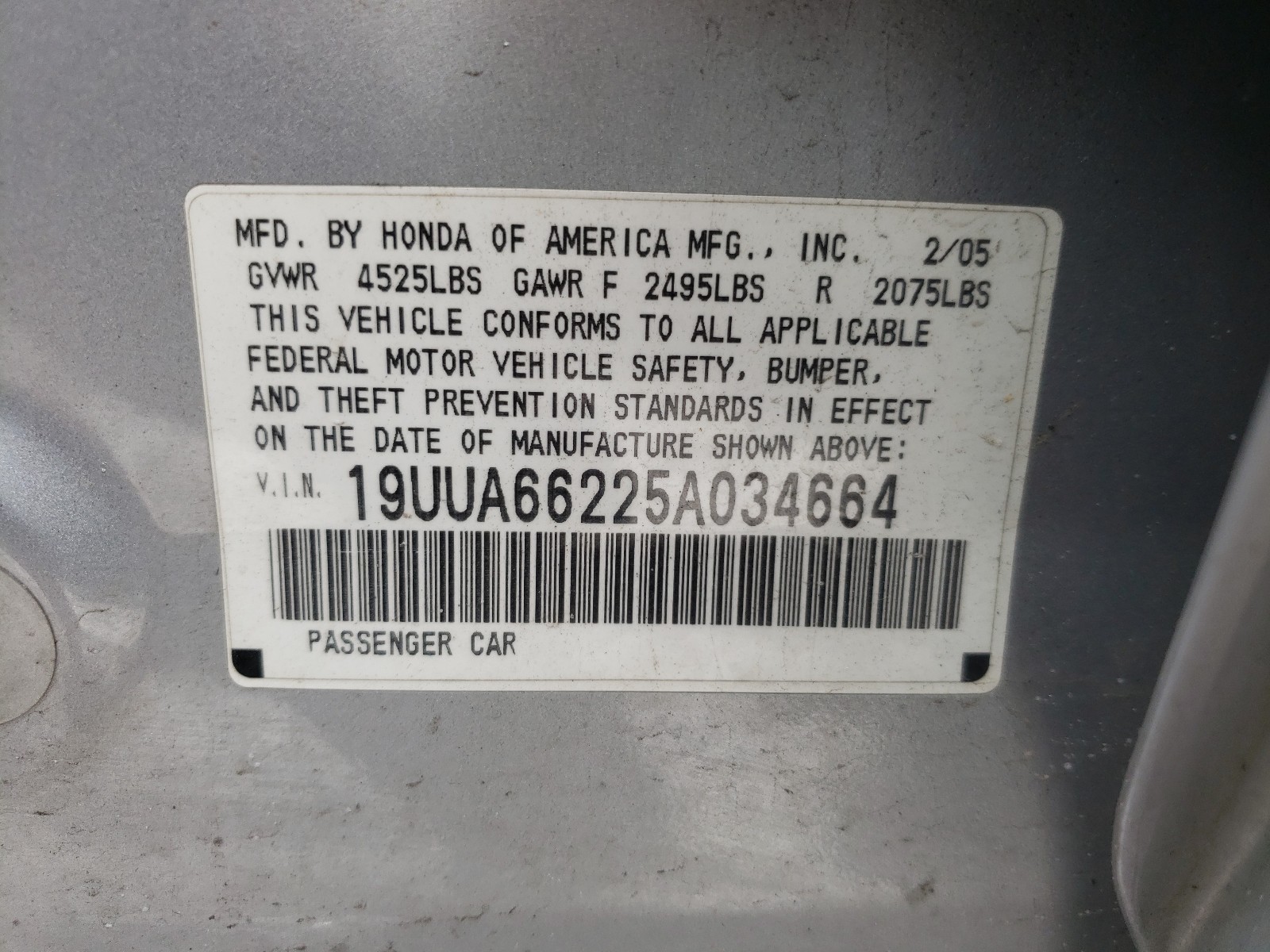 VIN: 19UUA66225A034664