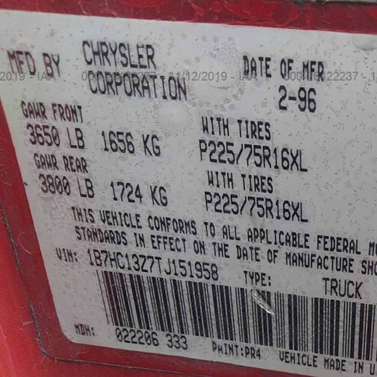 VIN: 1B7HC13Z7TJ151958