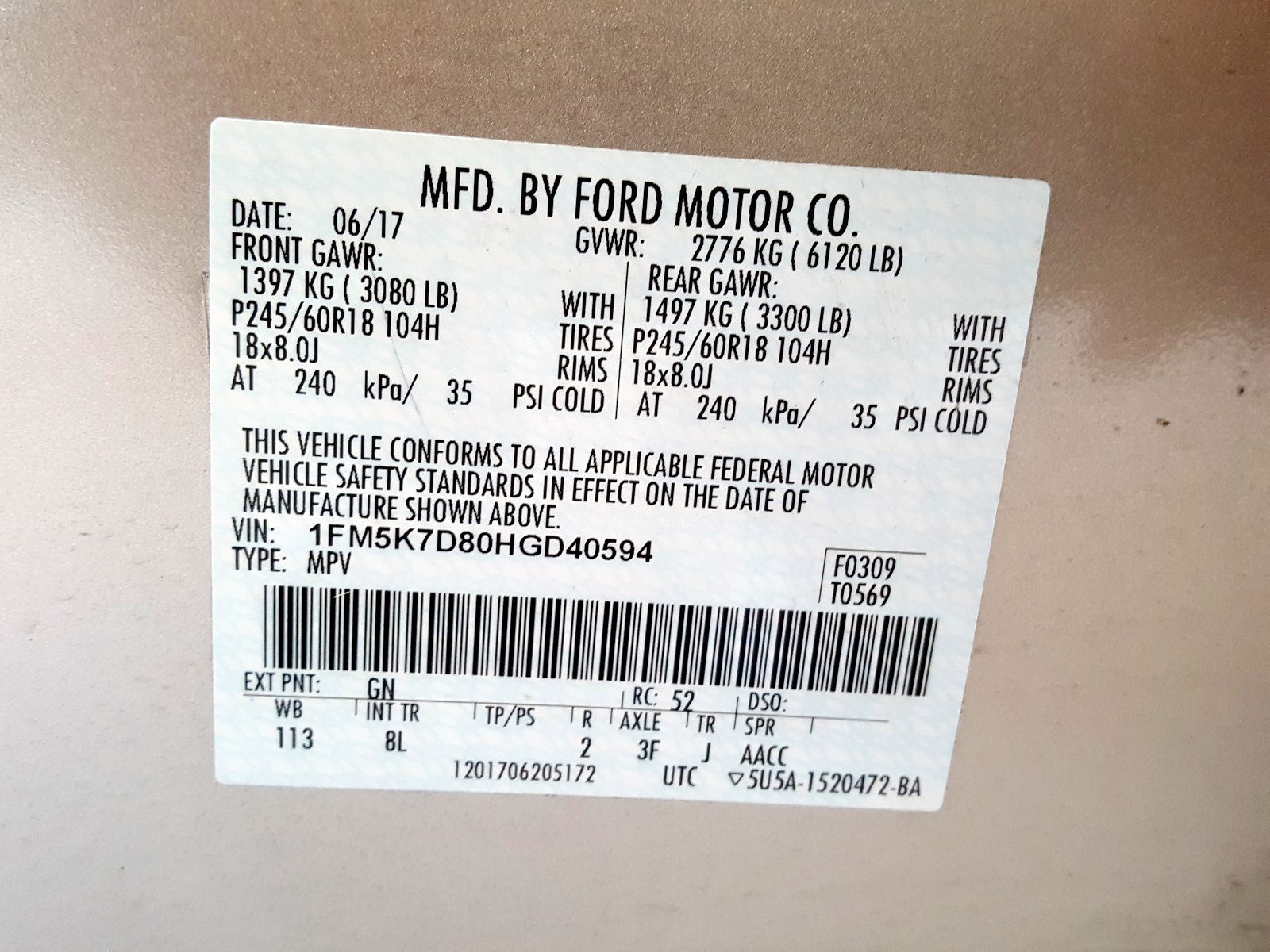 VIN: 1FM5K7D80HGD40594