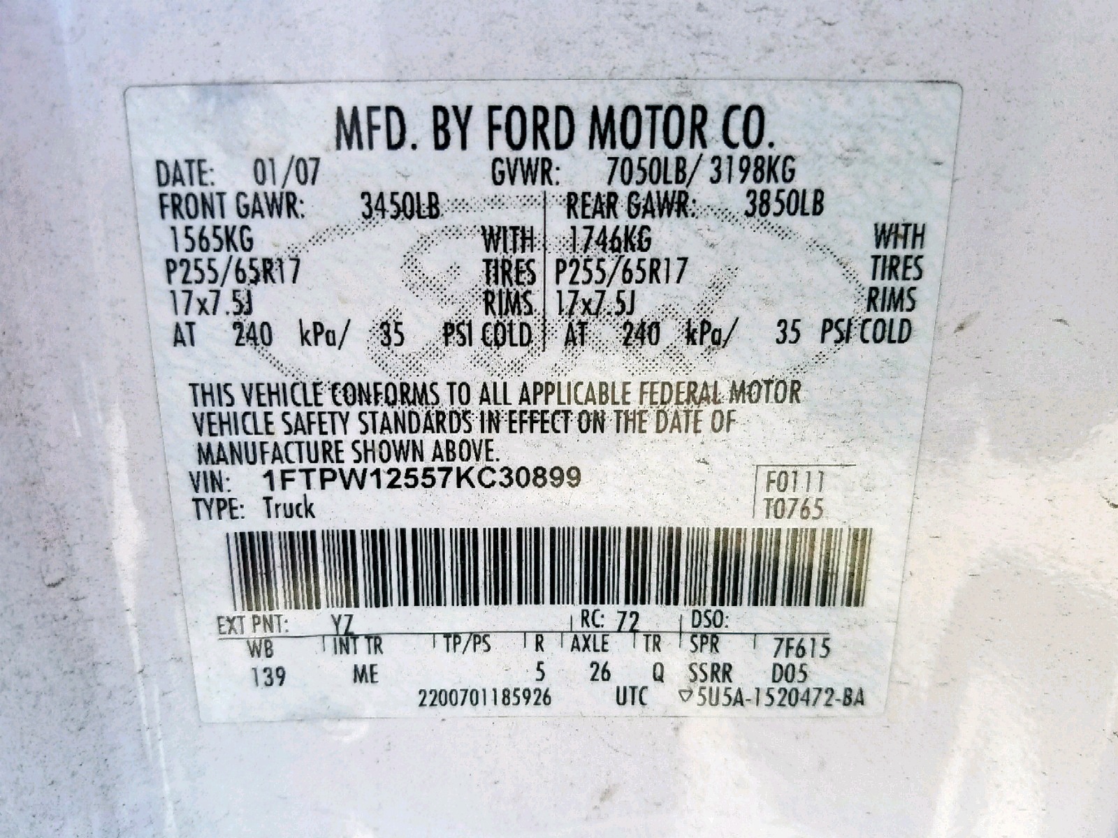 VIN: 1FTPW12557KC30899