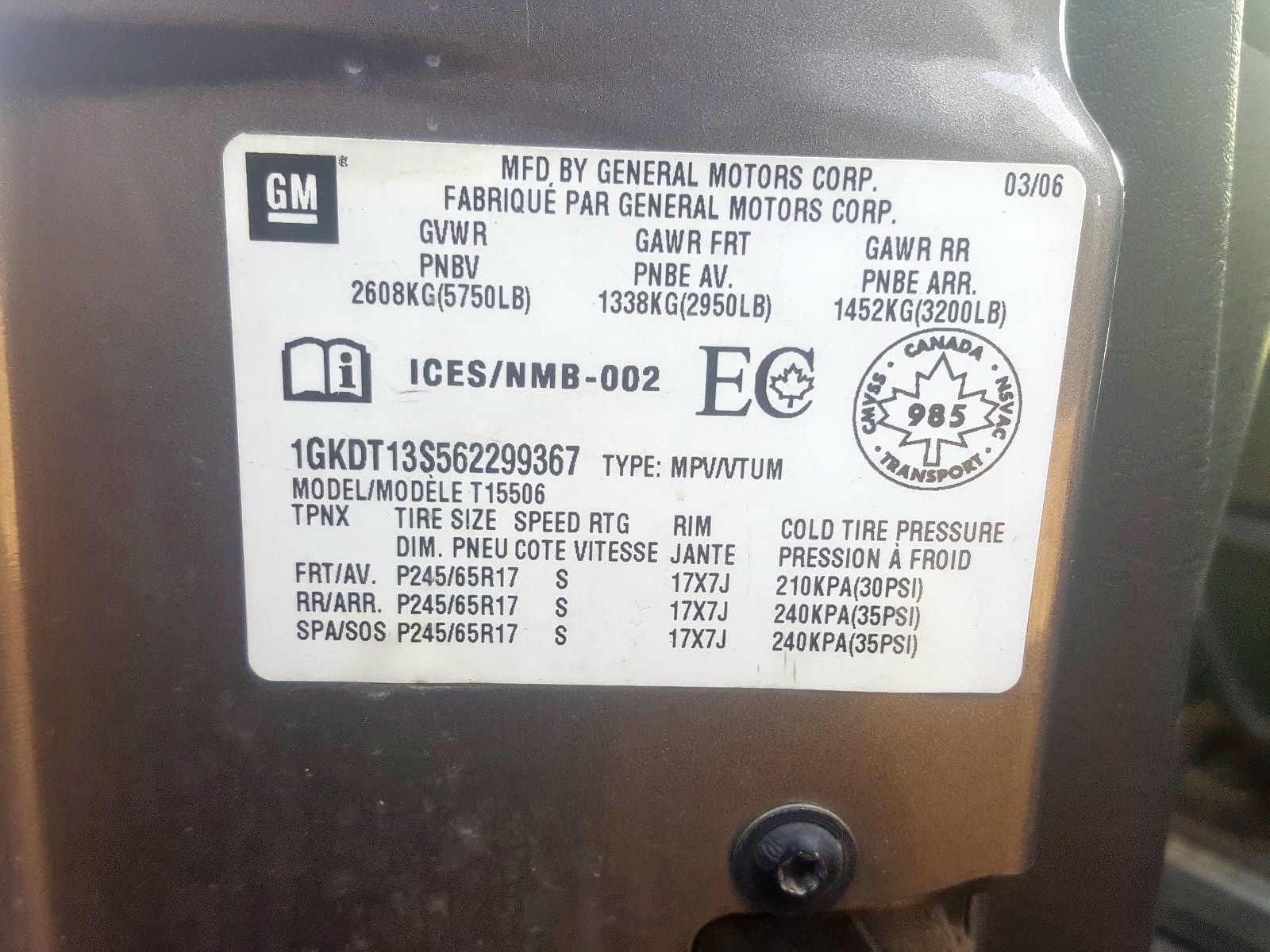 VIN: 1GKDT13S562299367