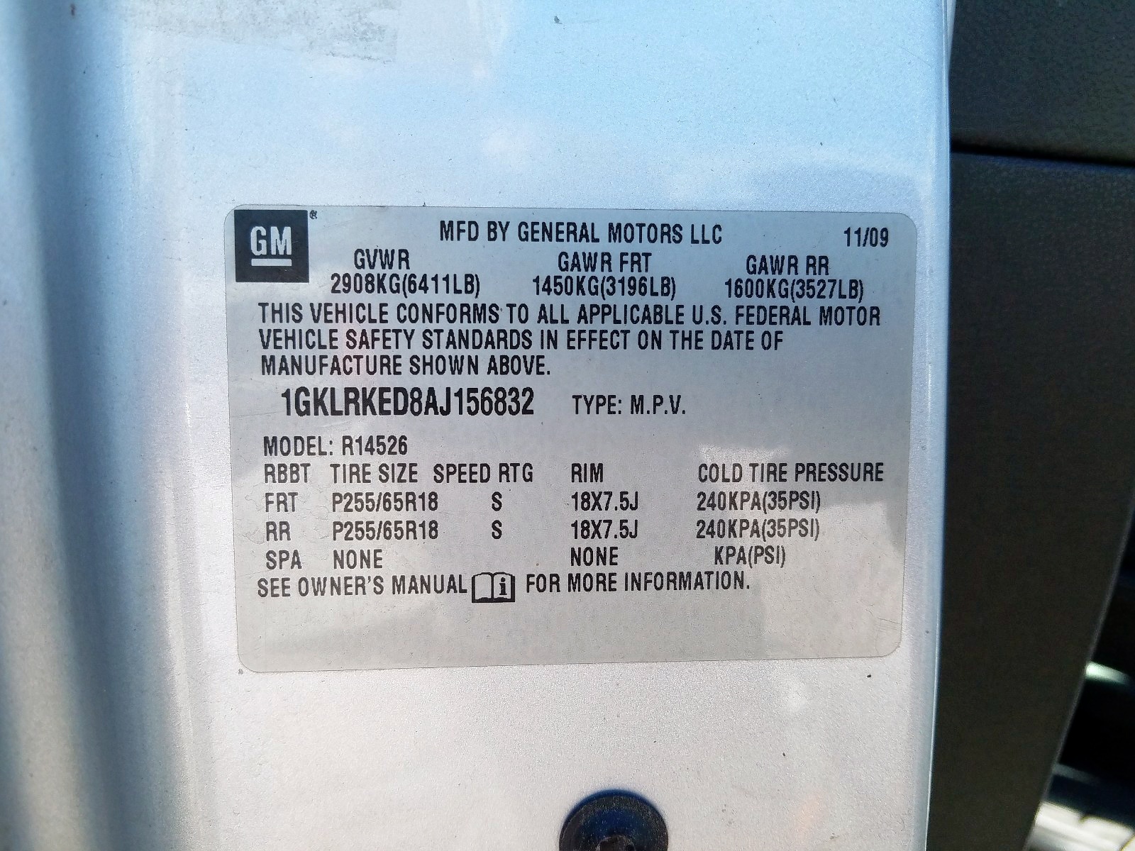 VIN: 1GKLRKED8AJ156832