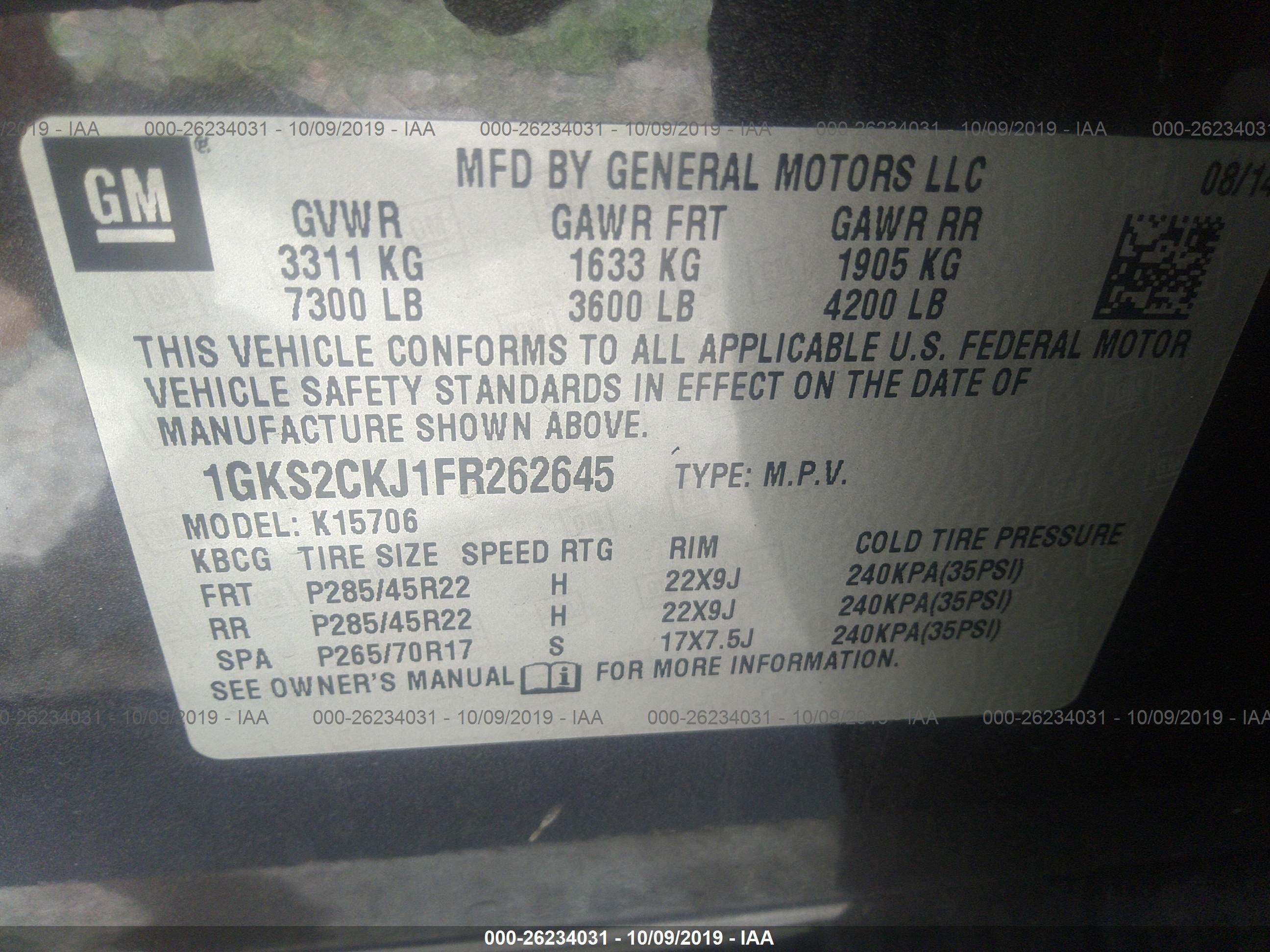 VIN: 1GKS2CKJ1FR262645