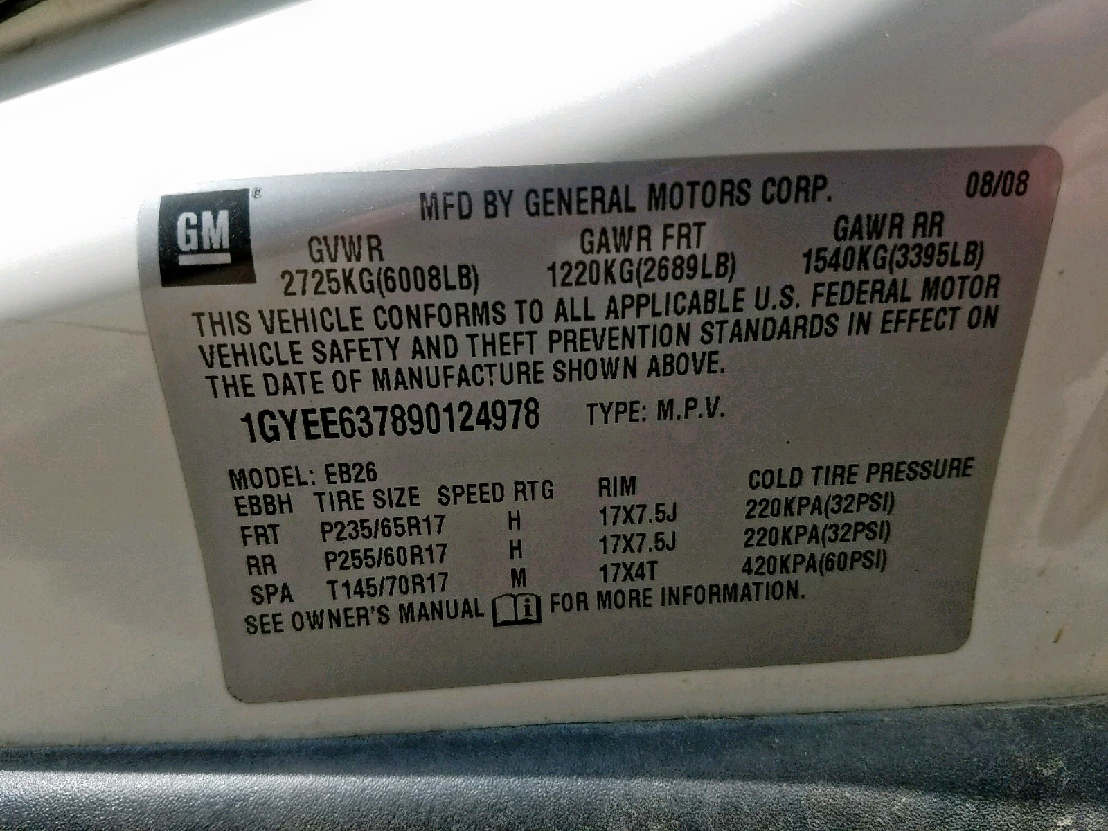 VIN: 1GYEE637890124978