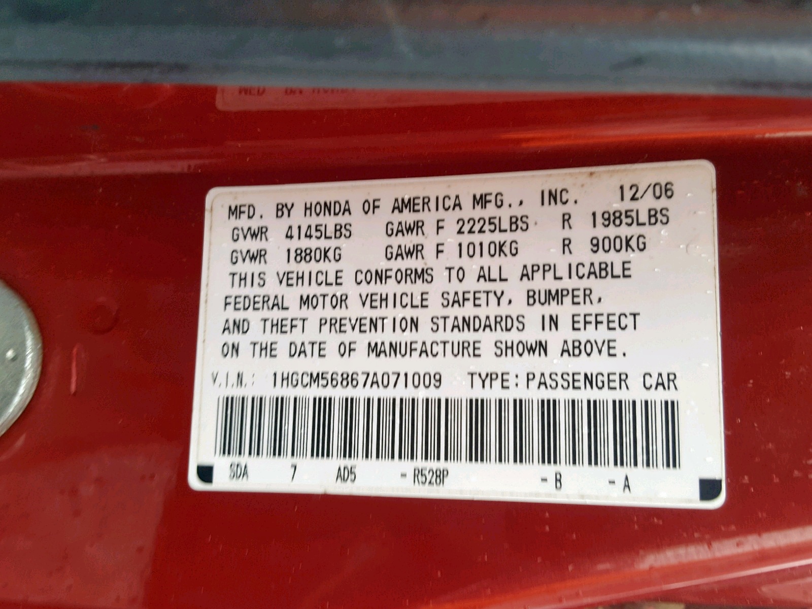 VIN: 1HGCM56867A071009