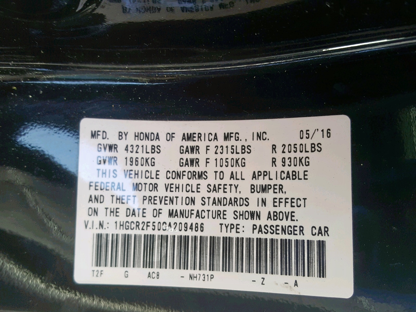 VIN: 1HGCR2F50GA209486