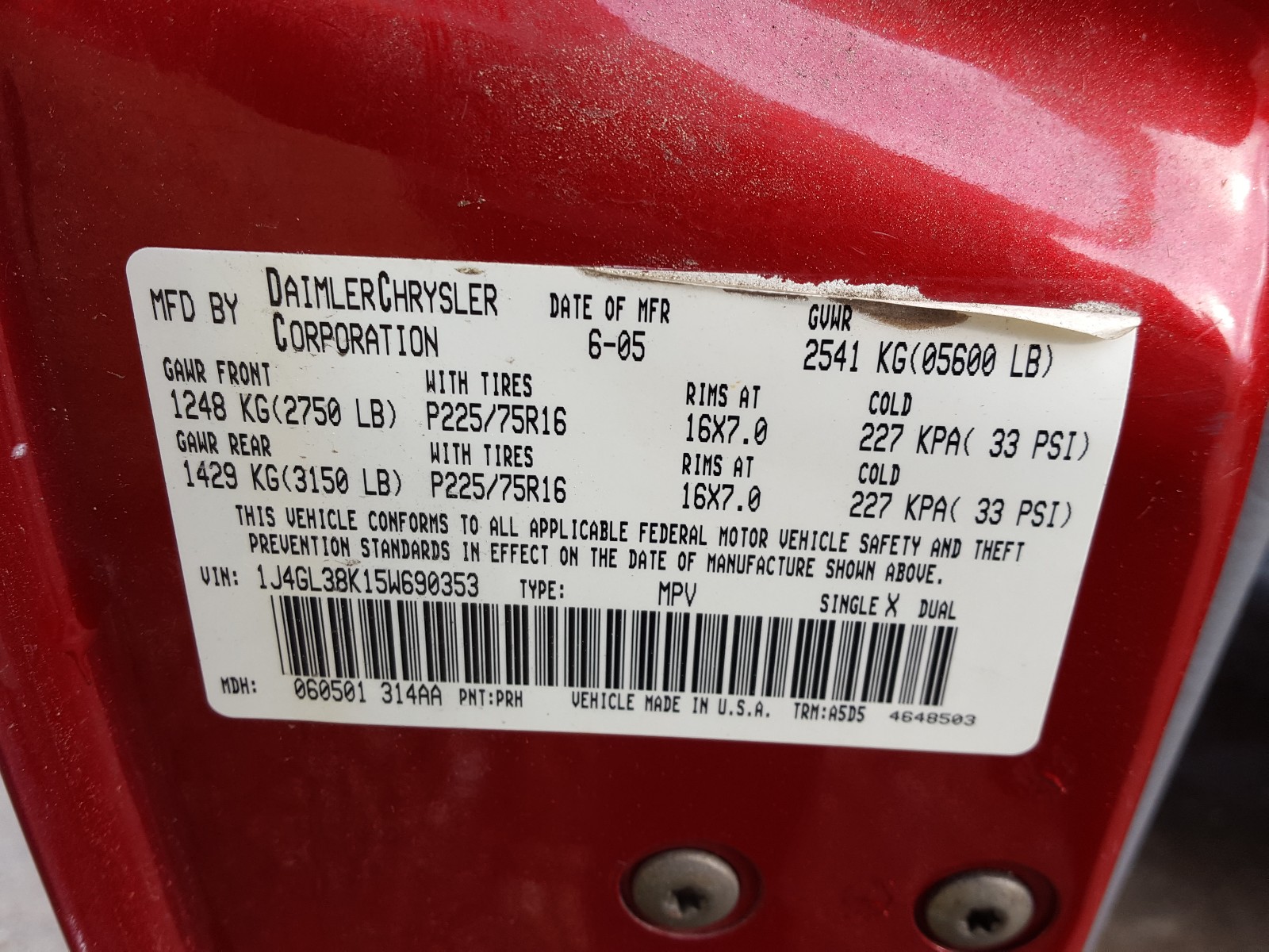 VIN: 1J4GL38K15W690353