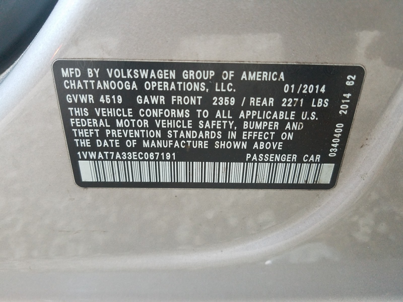 VIN: 1VWAT7A33EC067191