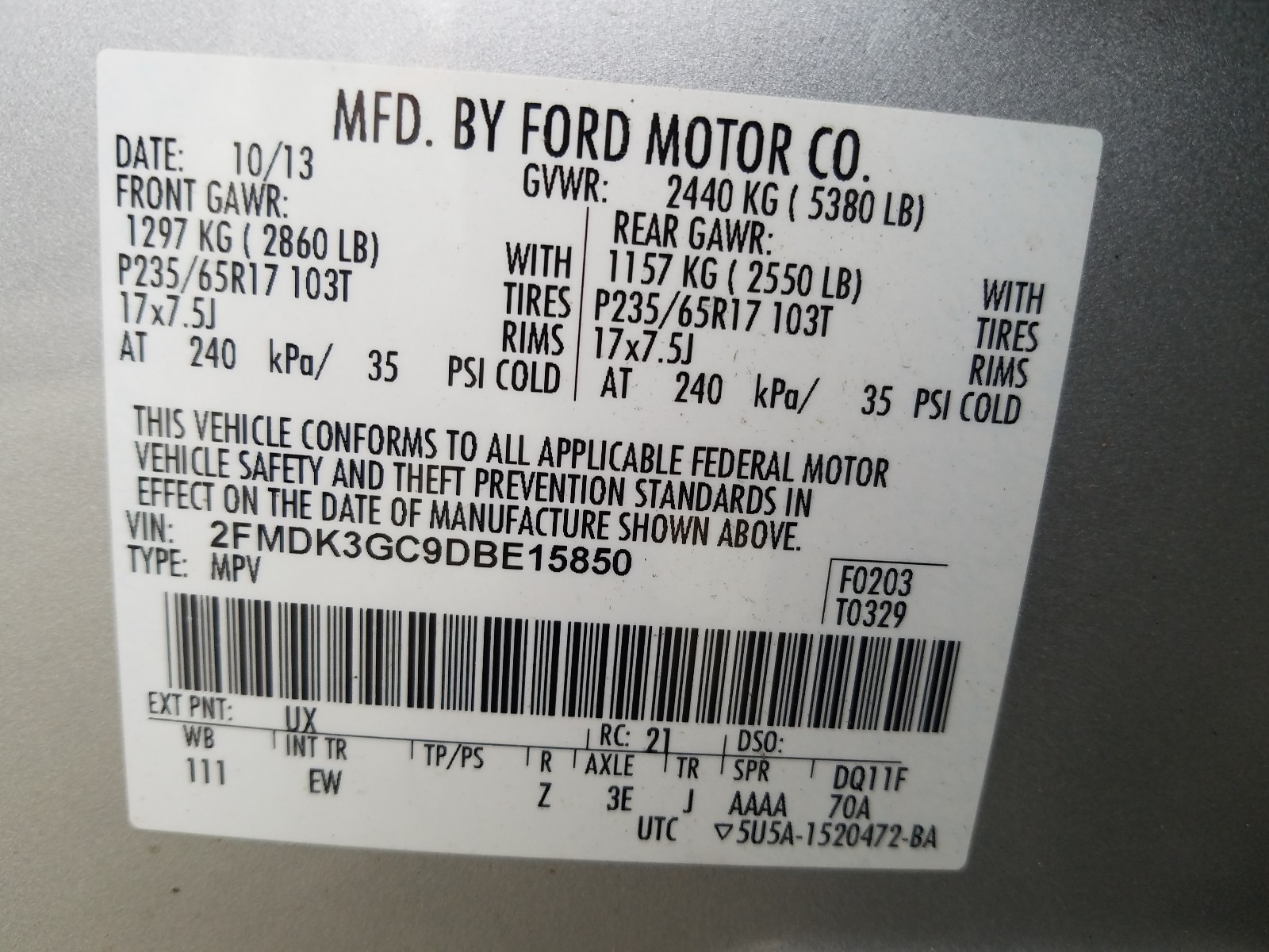 VIN: 2FMDK3GC9DBE15850