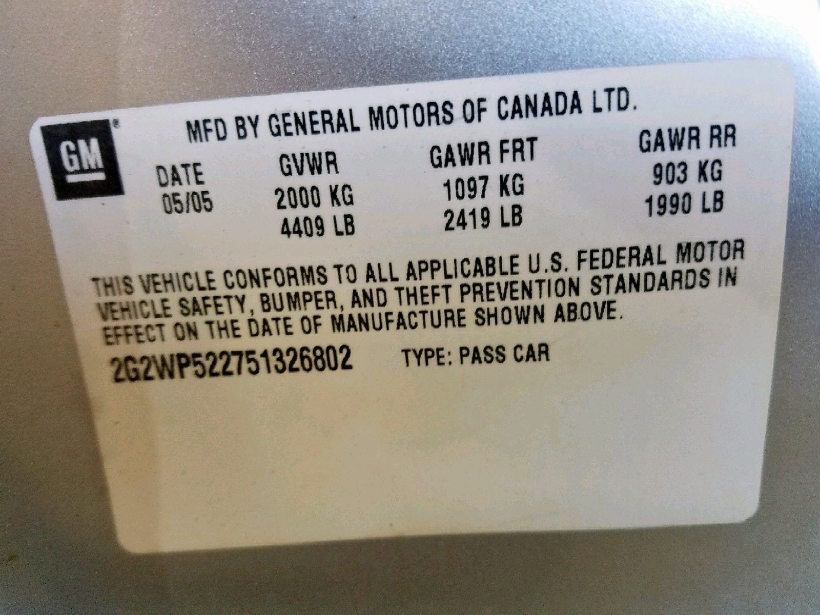 VIN: 2G2WP522751326802