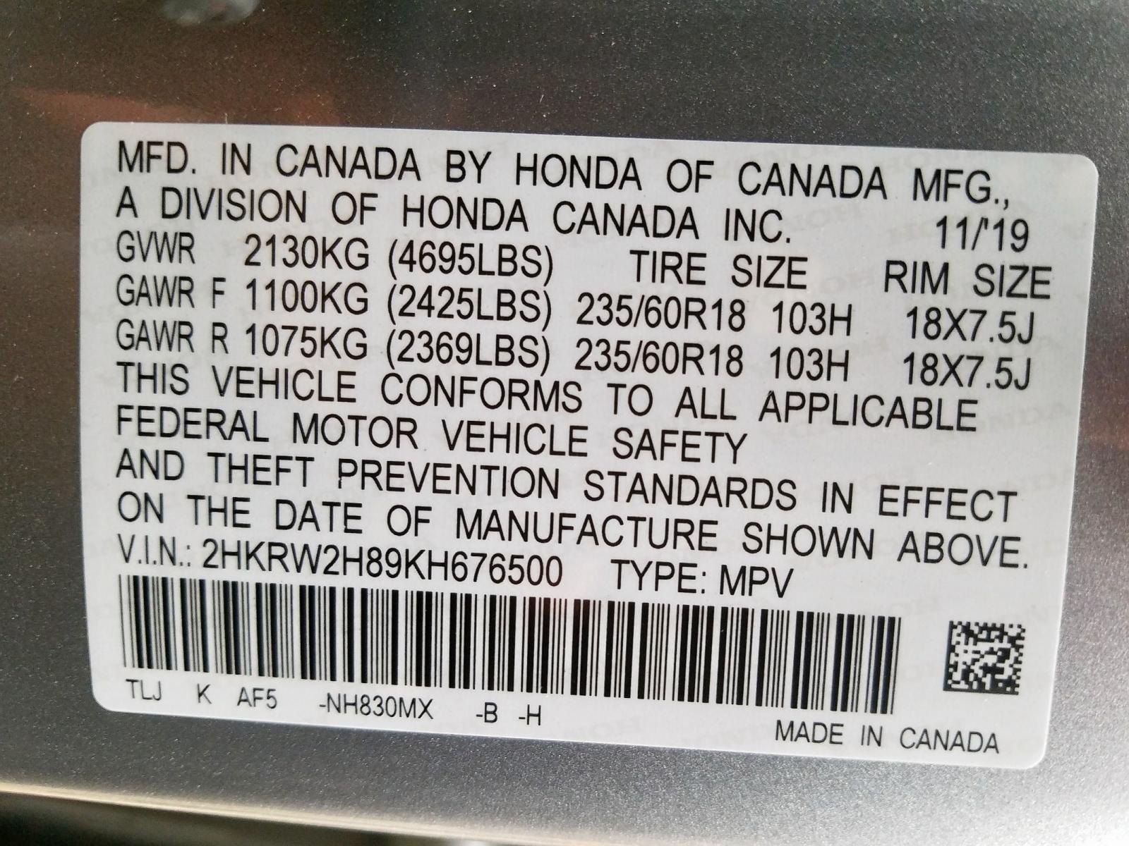VIN: 2HKRW2H89KH676500