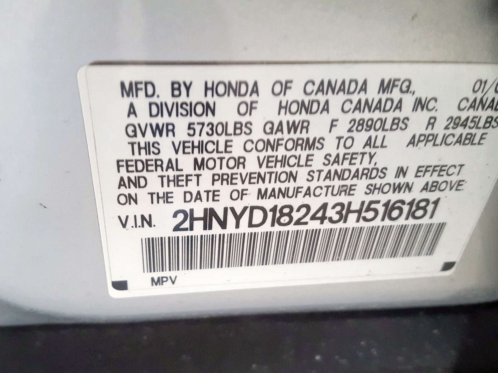 VIN: 2HNYD18243H516181