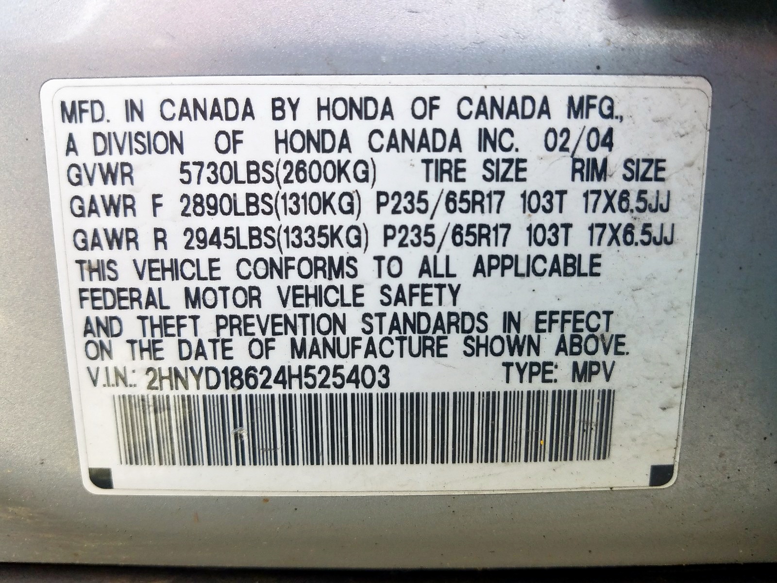 VIN: 2HNYD18624H525403