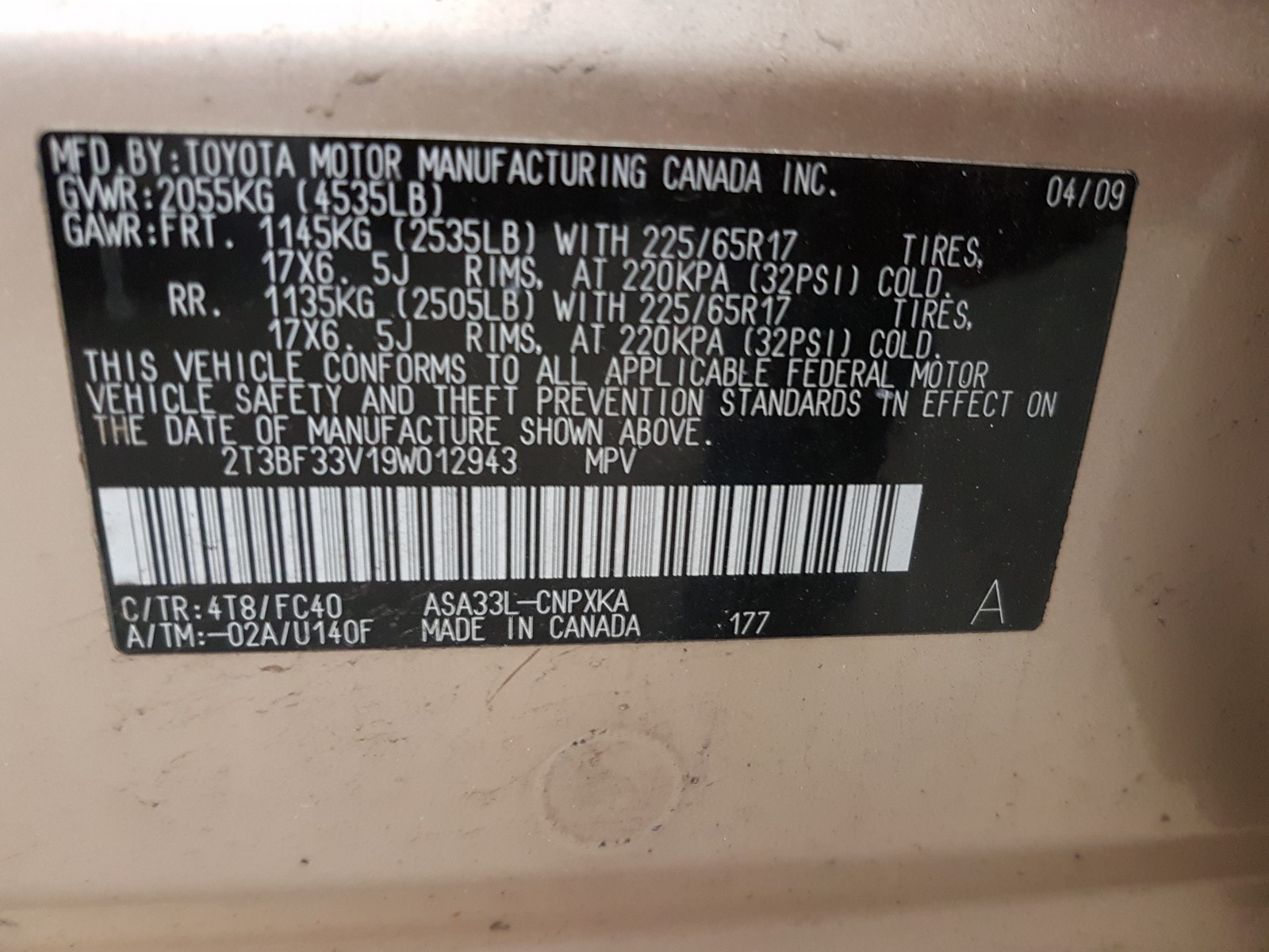 VIN: 2T3BF33V19W012943