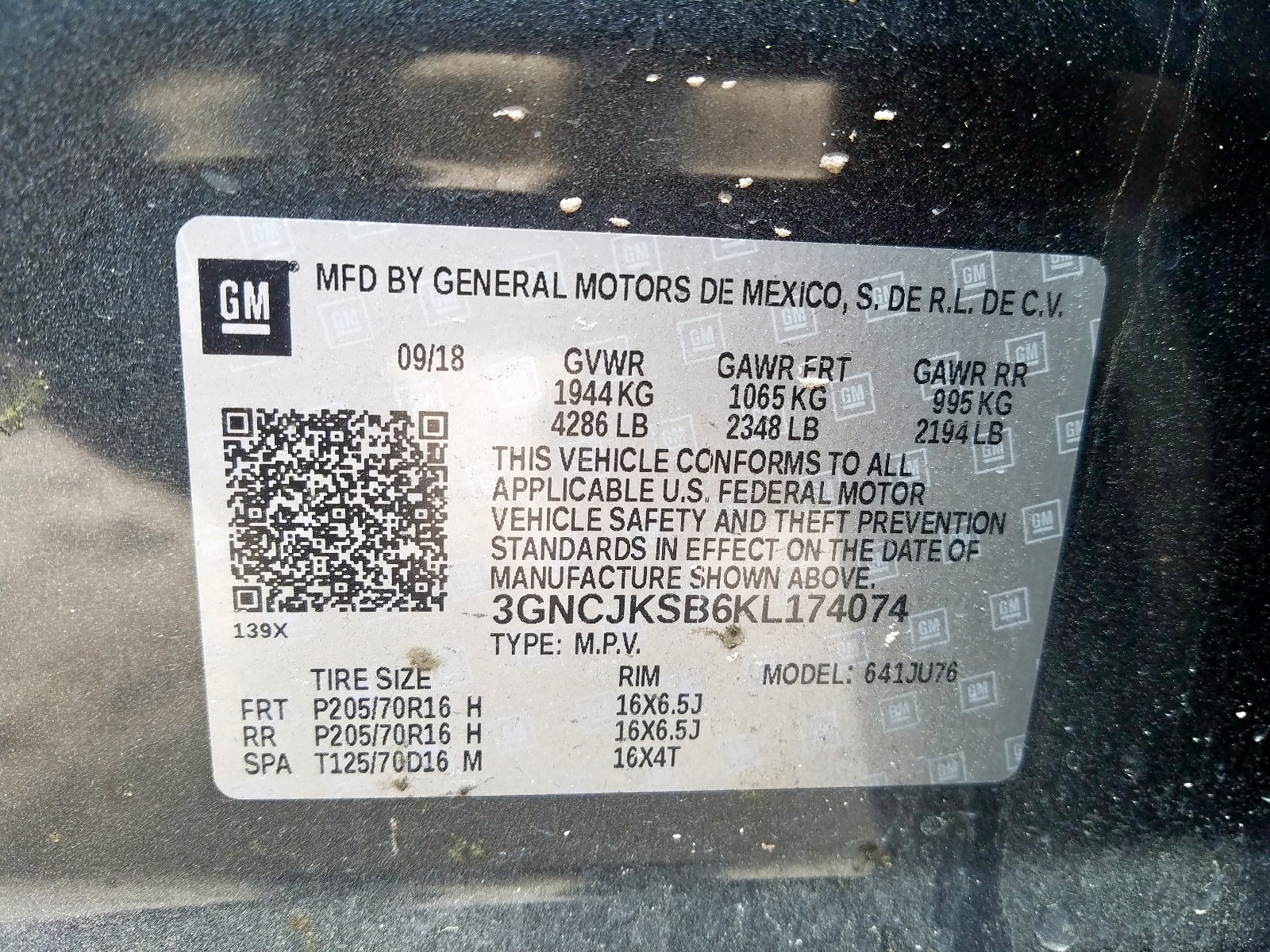 VIN: 3GNCJKSB6KL174074