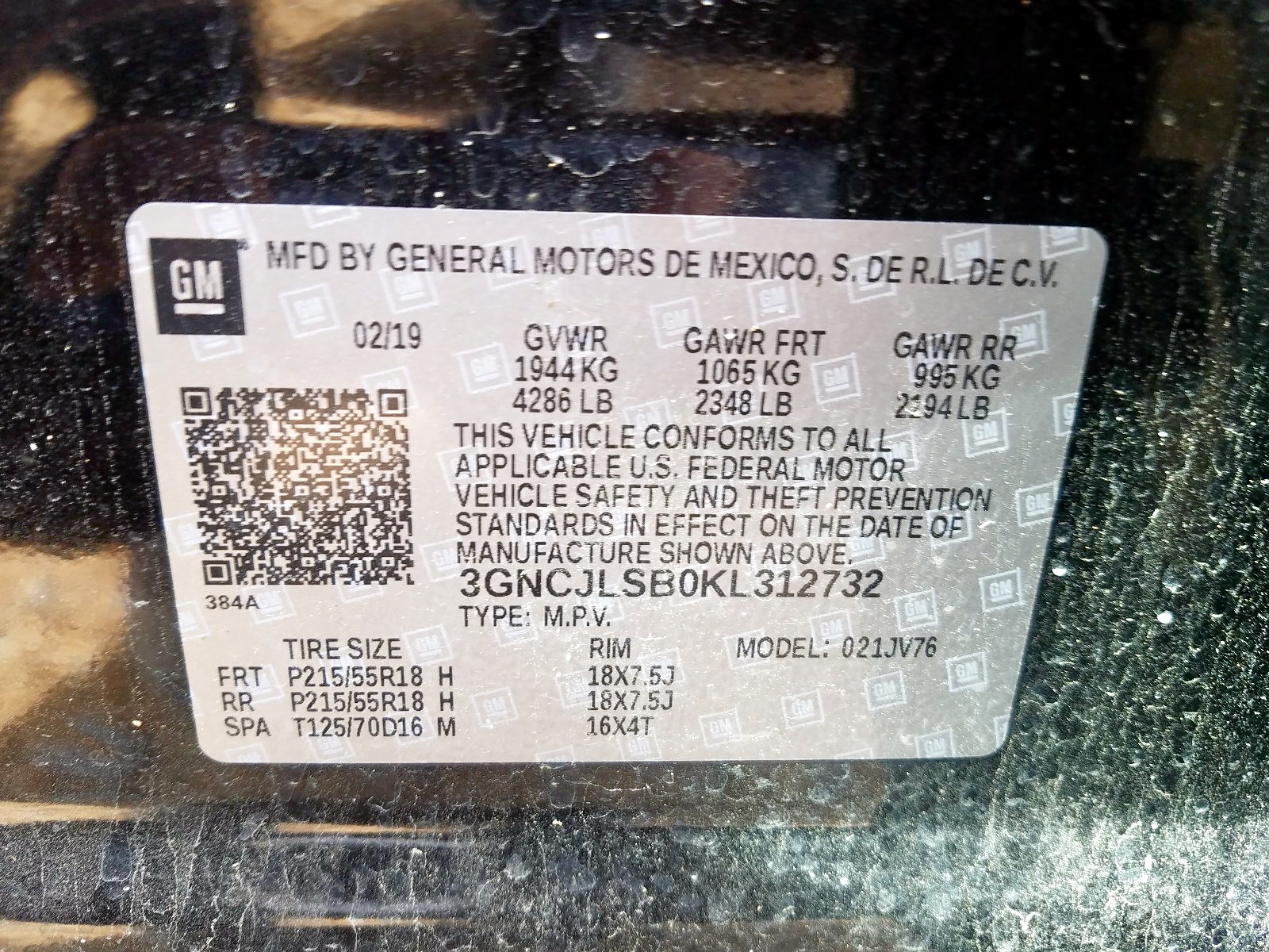 VIN: 3GNCJLSB0KL312732