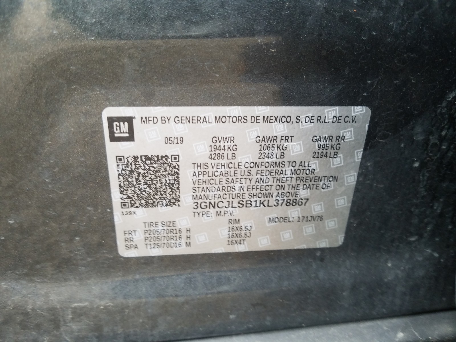 VIN: 3GNCJLSB1KL378867