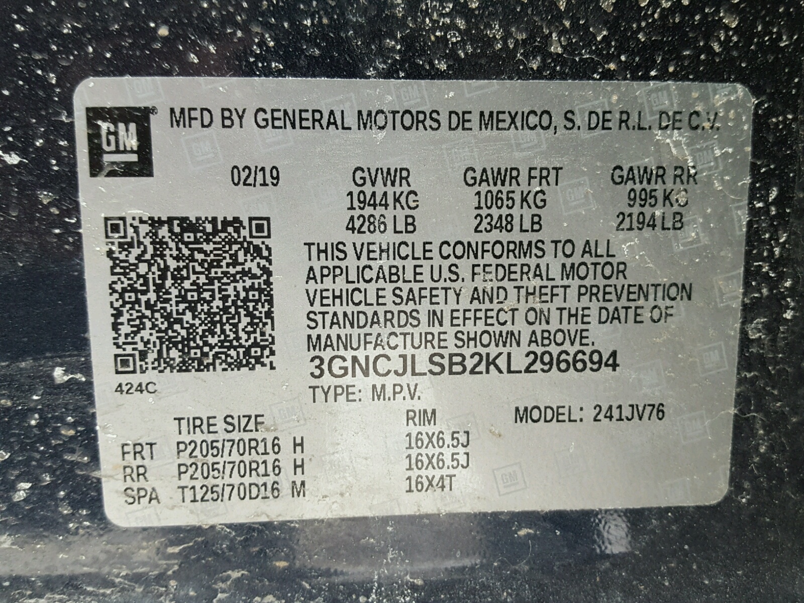 VIN: 3GNCJLSB2KL296694