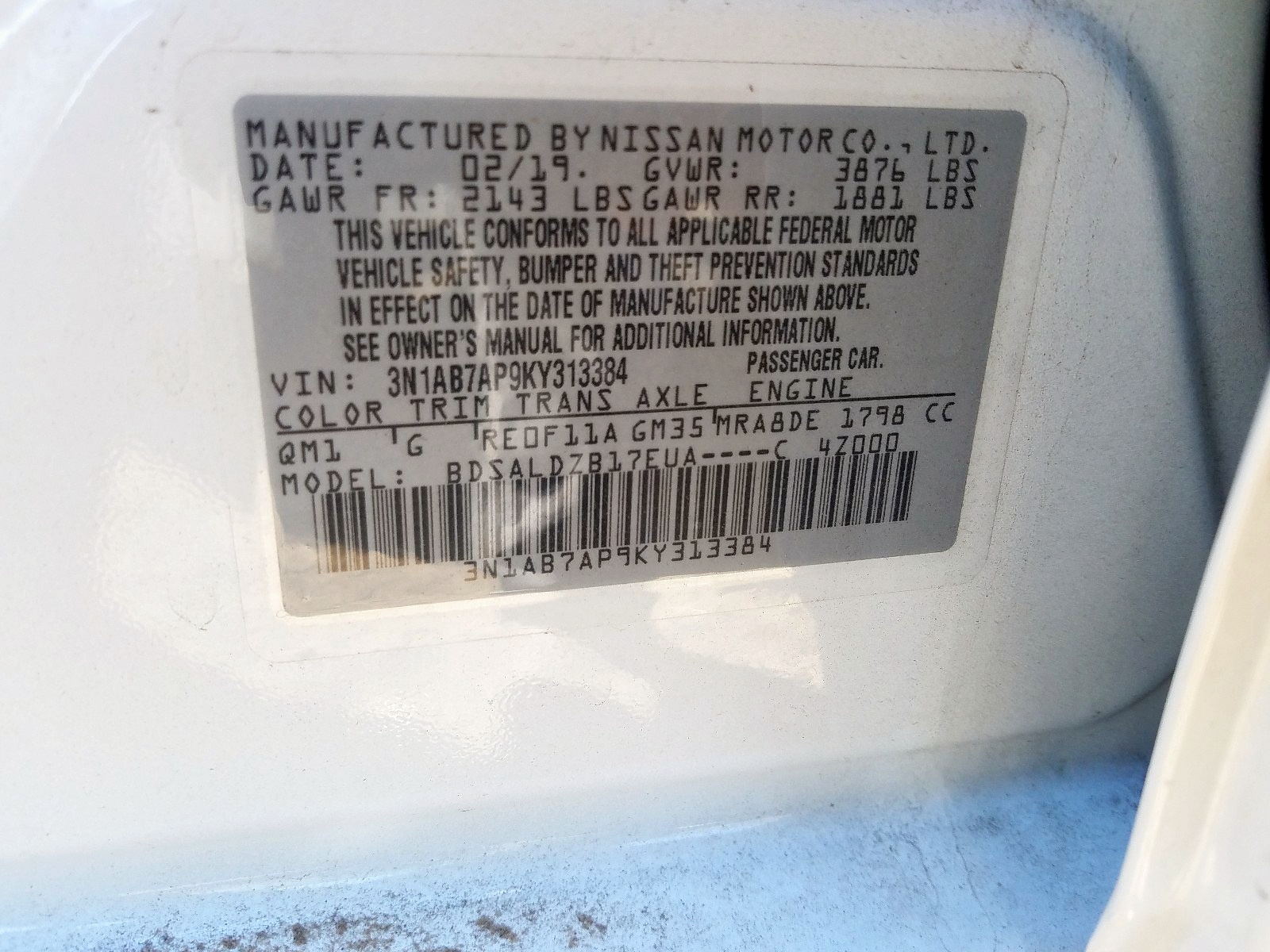 VIN: 3N1AB7AP9KY313384