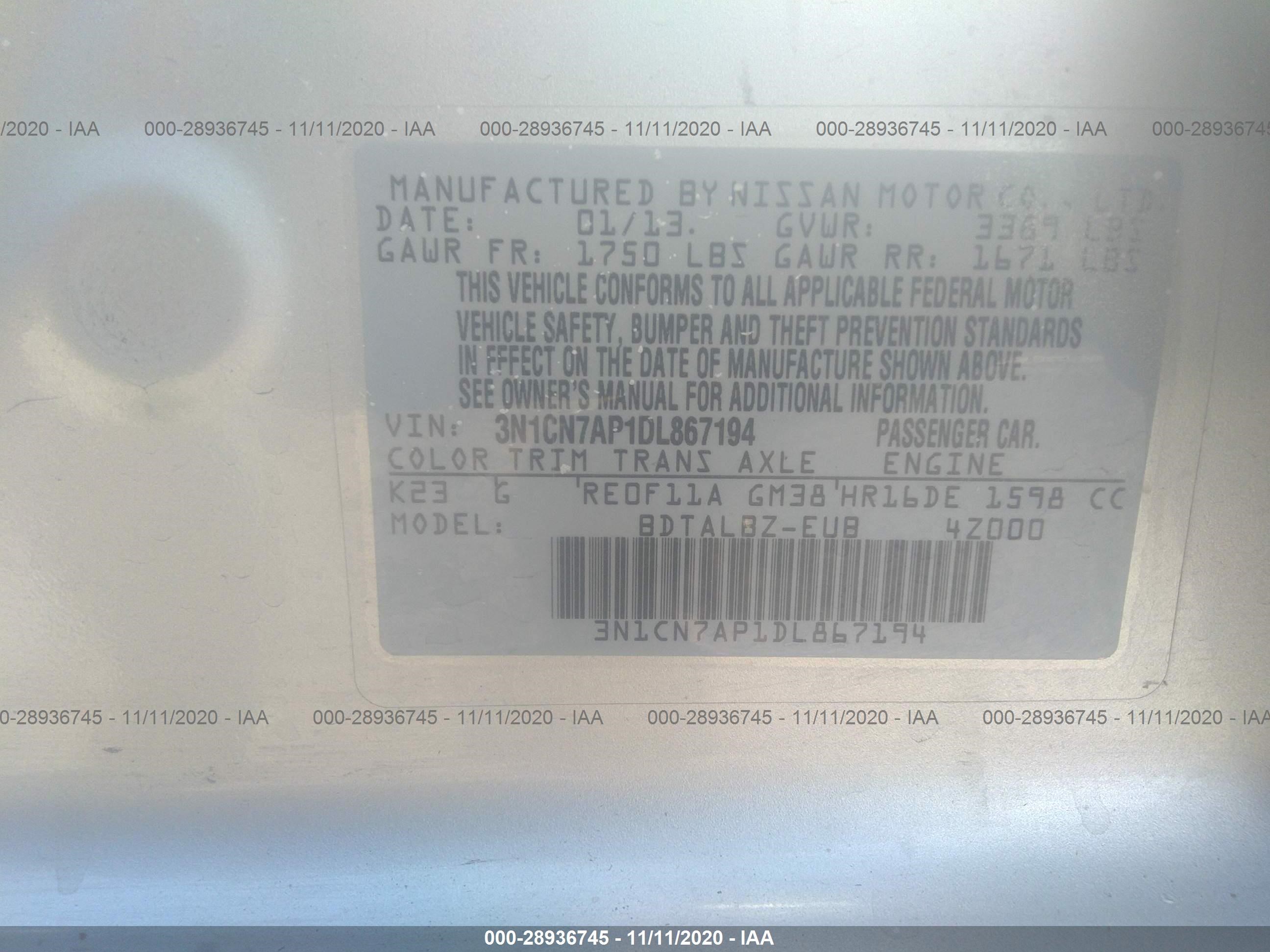 VIN: 3N1CN7AP1DL867194