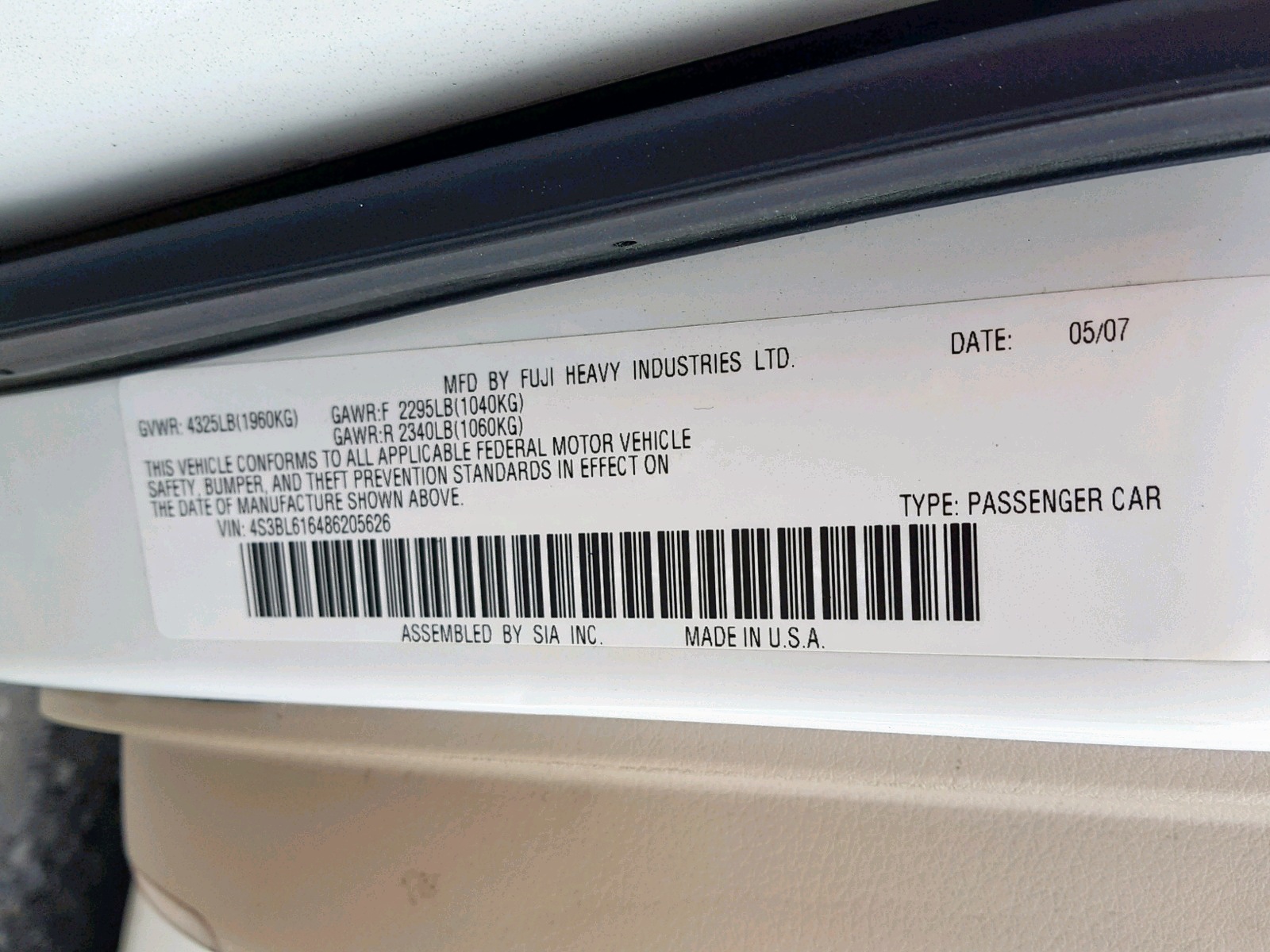 VIN: 4S3BL616486205626