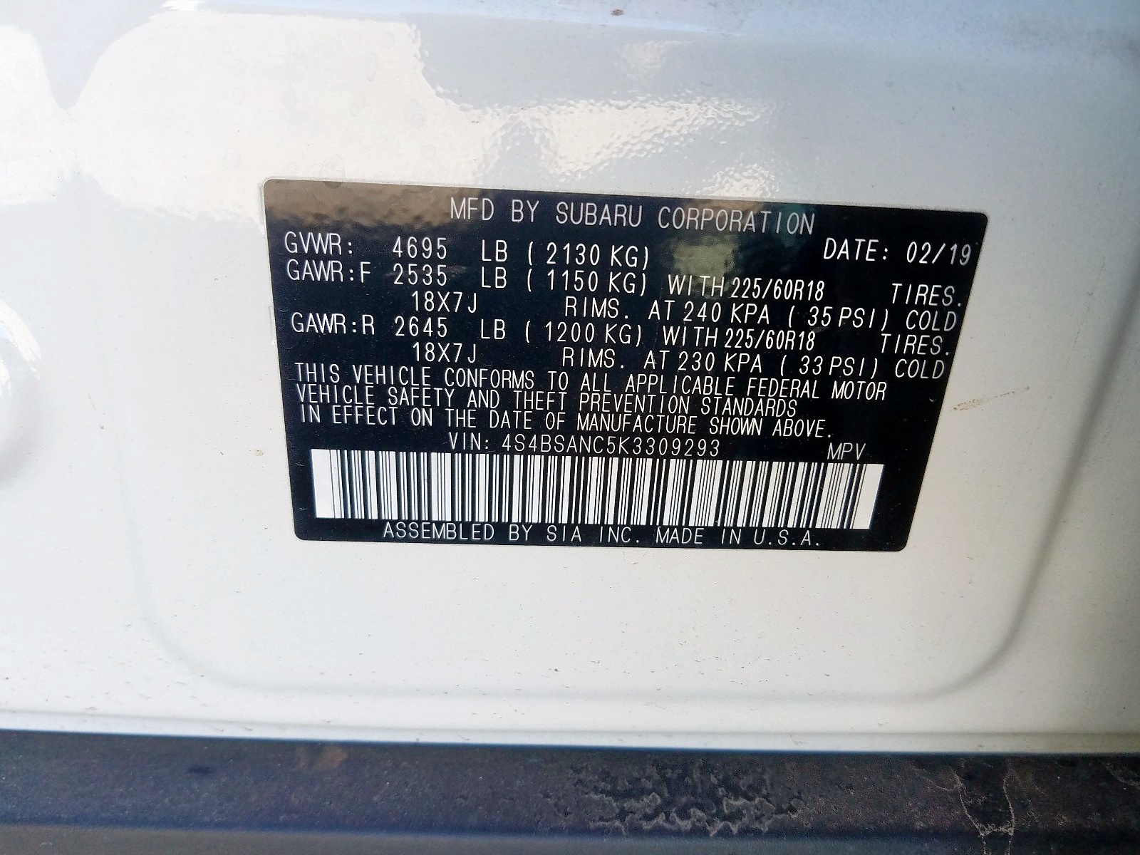 VIN: 4S4BSANC5K3309293