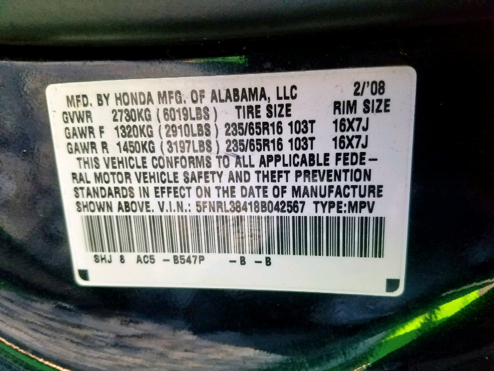 VIN: 5FNRL38418B042567