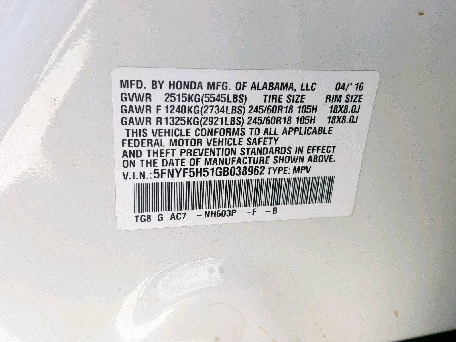 VIN: 5FNYF5H51GB038962