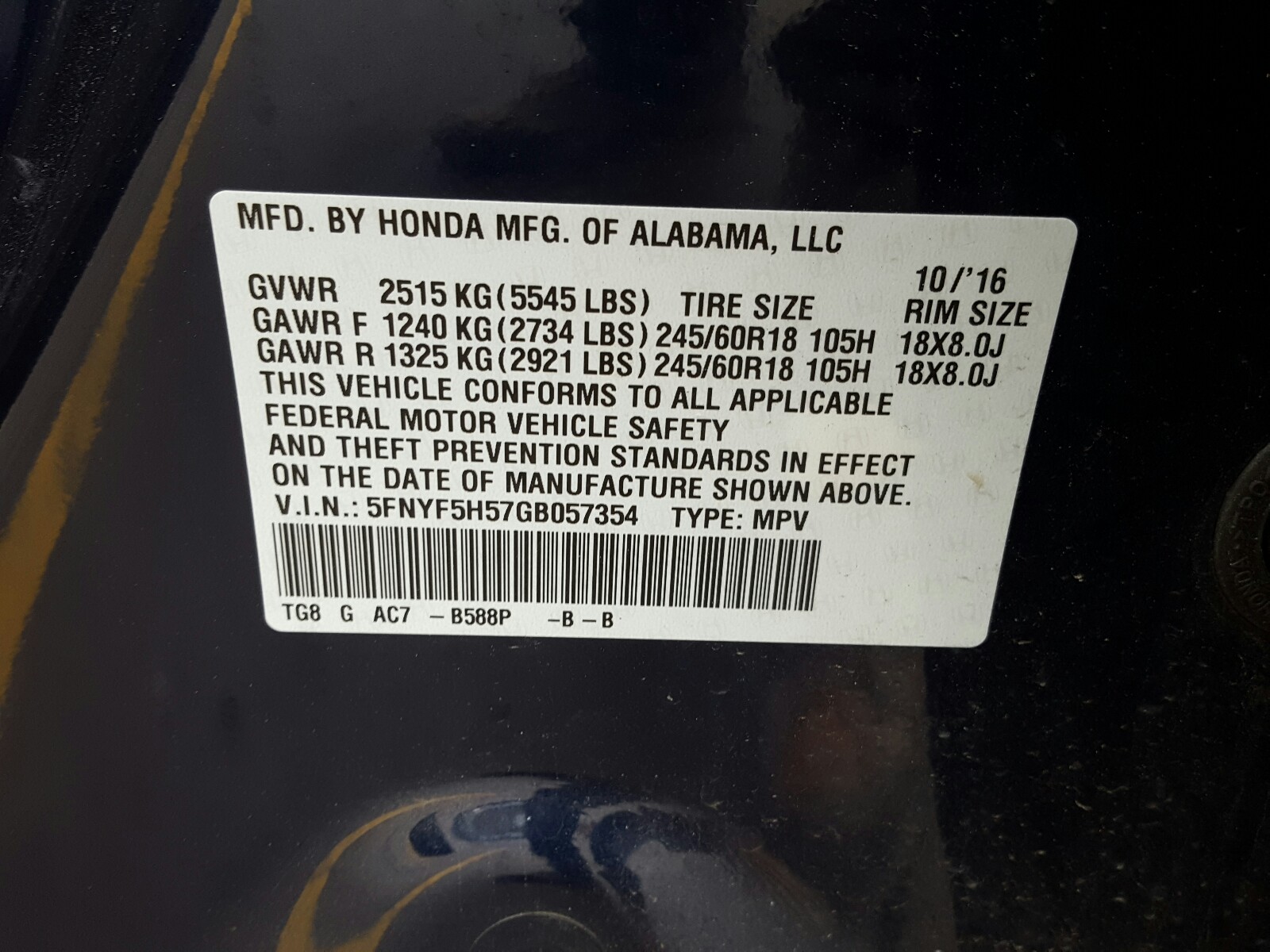 VIN: 5FNYF5H57GB057354