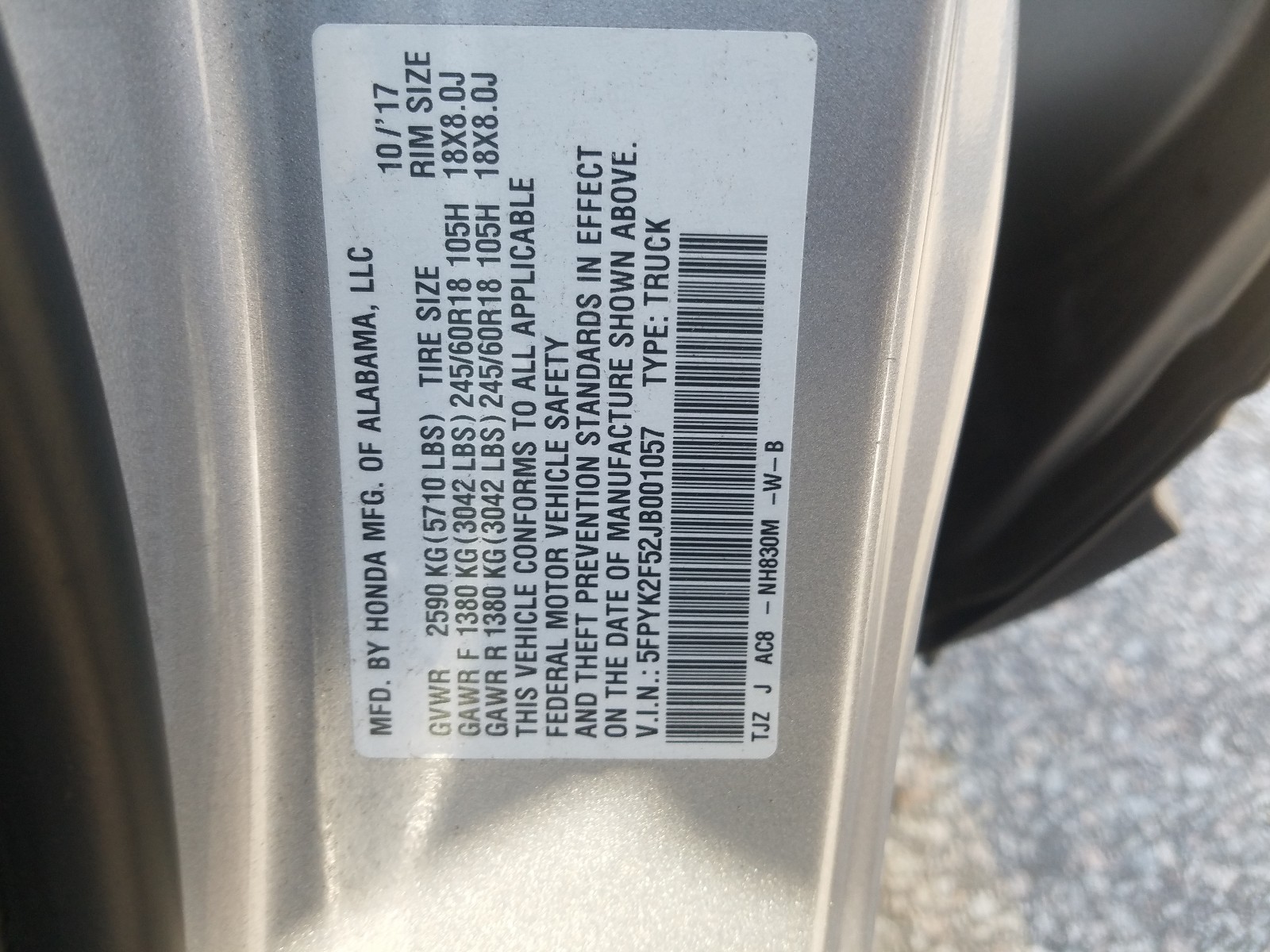 VIN: 5FPYK2F52JB001057