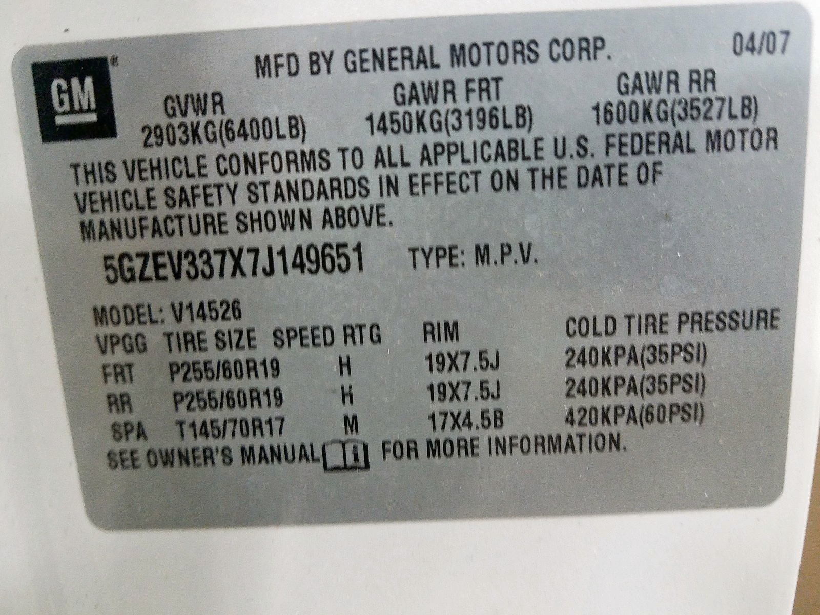 VIN: 5GZEV337X7J149651