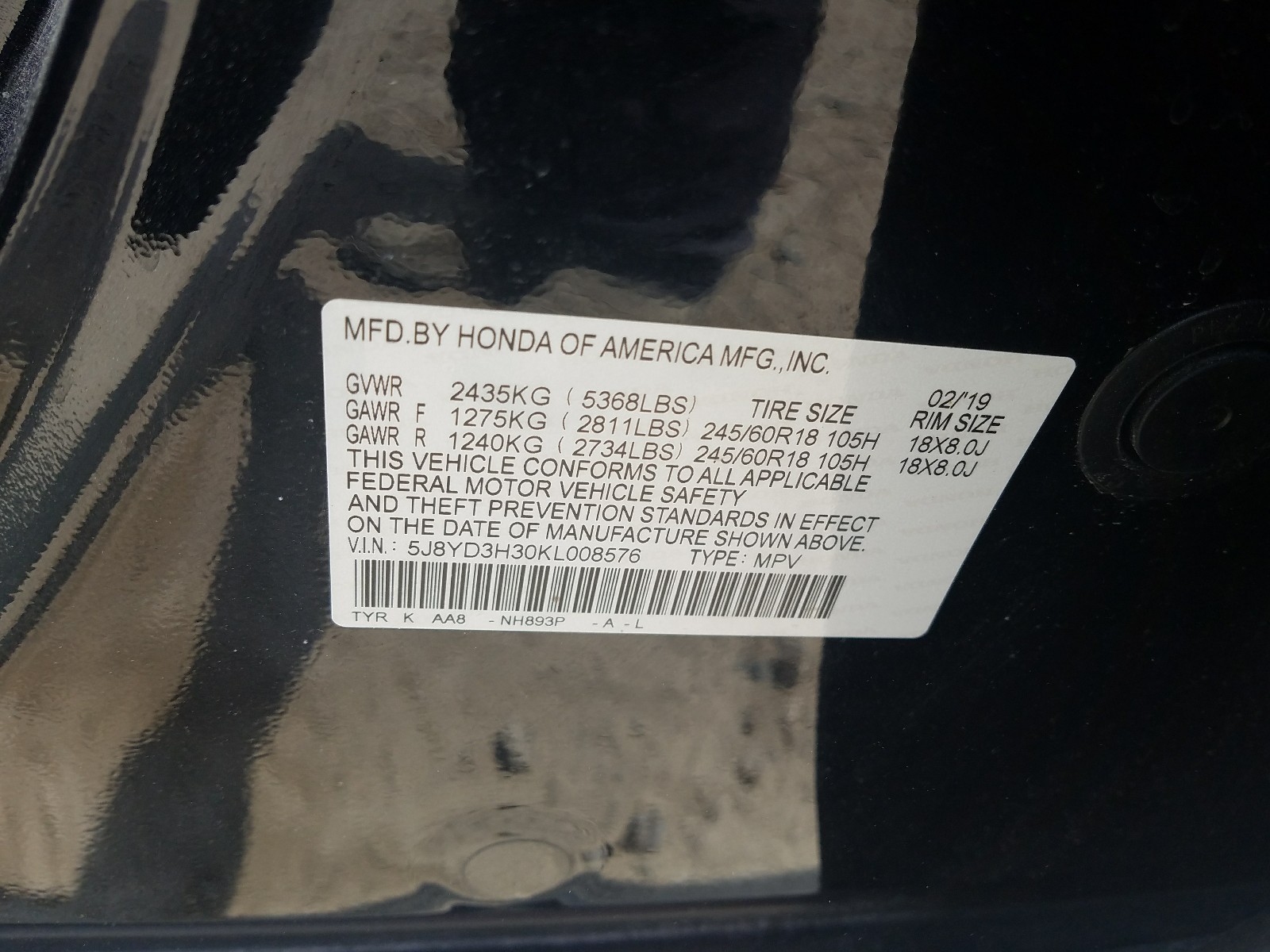 VIN: 5J8YD3H30KL008576