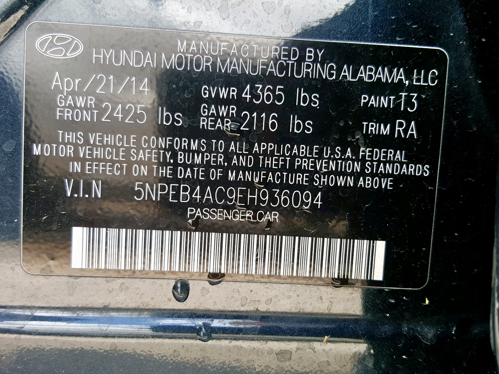 VIN: 5NPEB4AC9EH936094
