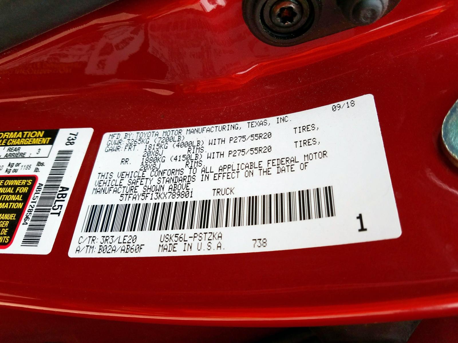 VIN: 5TFAY5F13KX789801