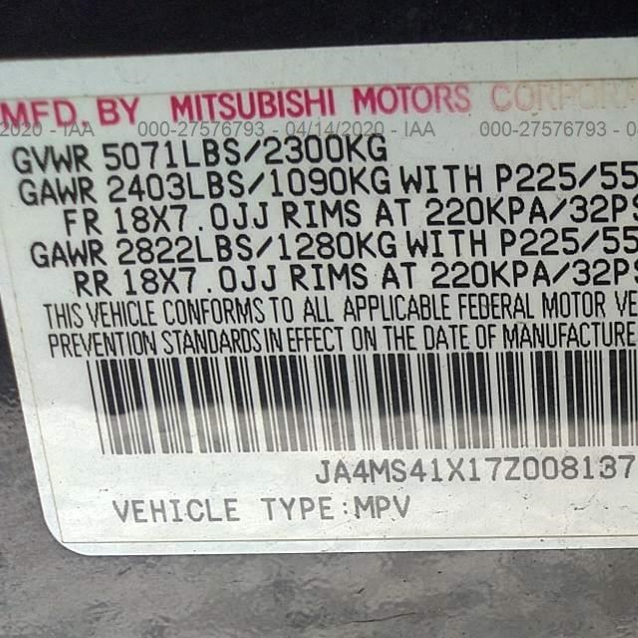 VIN: JA4MS41X17Z008137