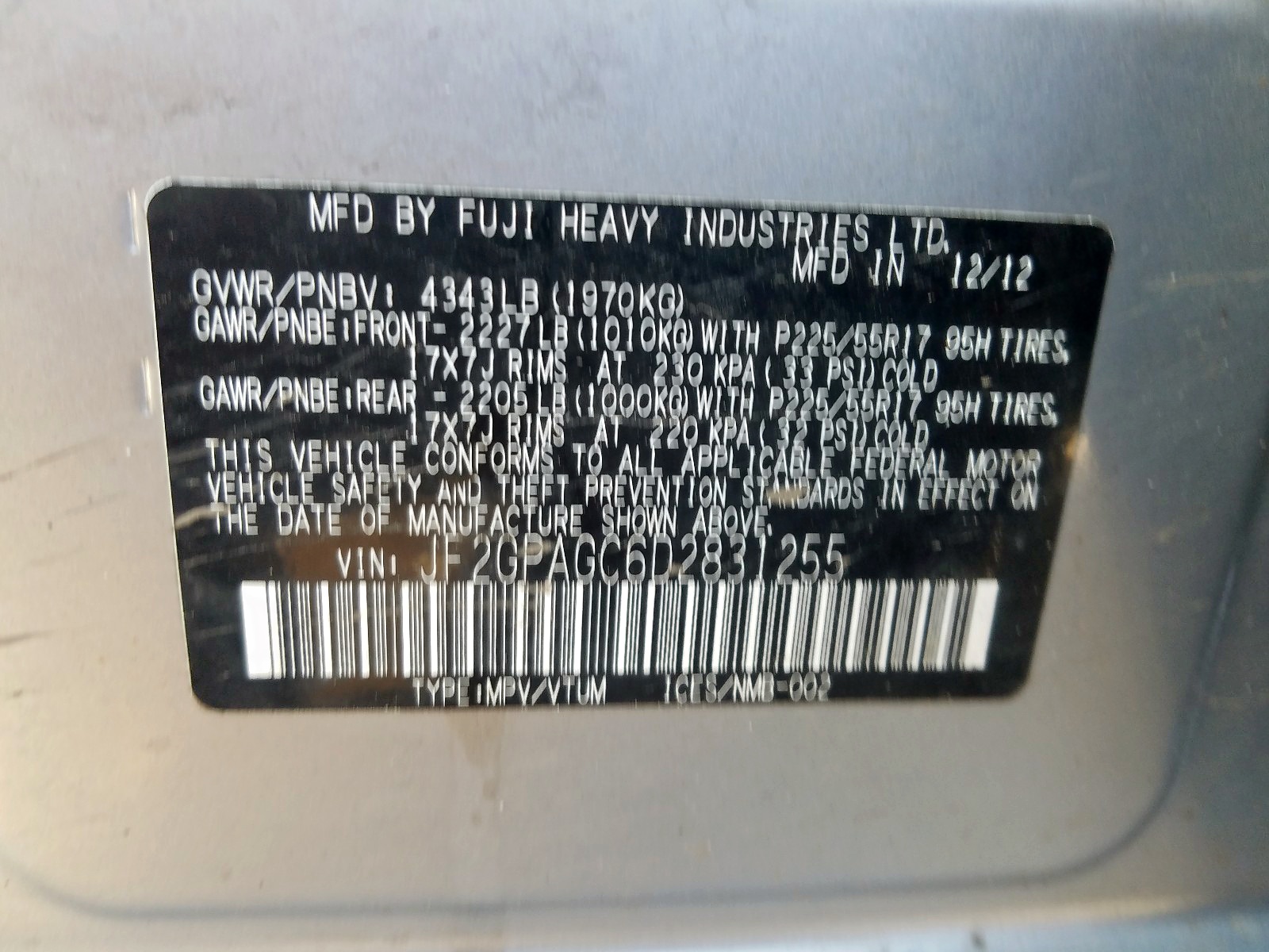VIN: JF2GPAGC6D2831255