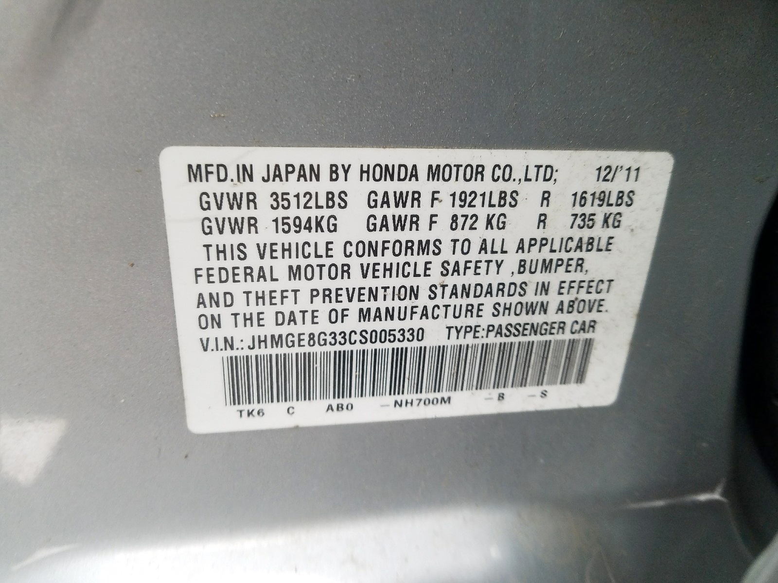 VIN: JHMGE8G33CS005330