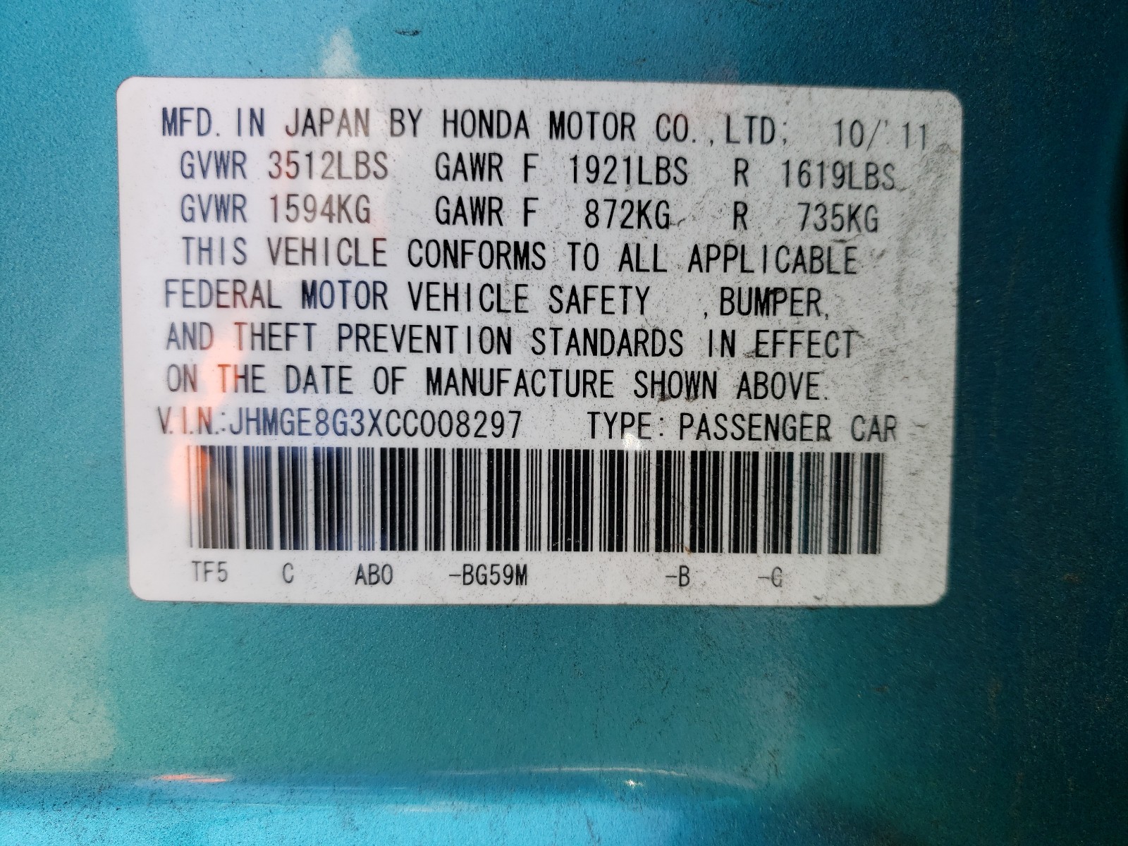 VIN: JHMGE8G3XCC008297