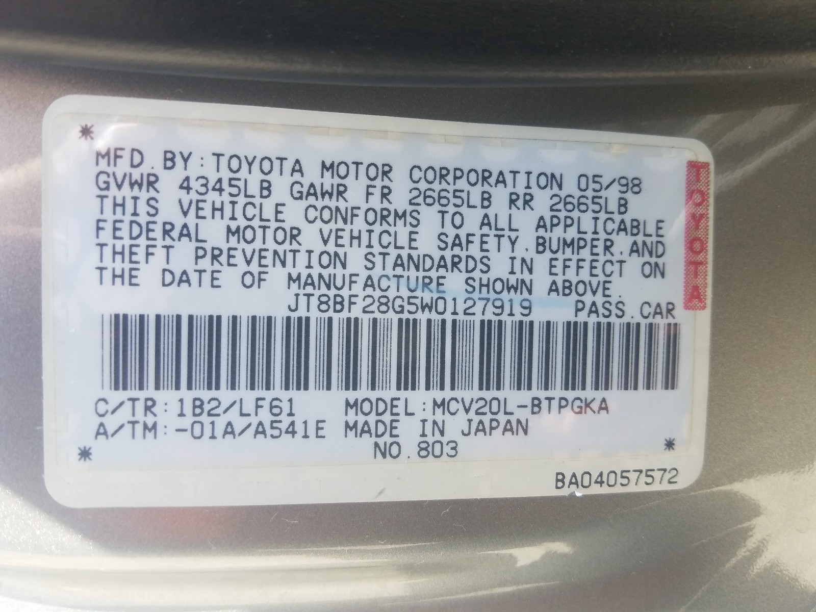 VIN: JT8BF28G5W0127919