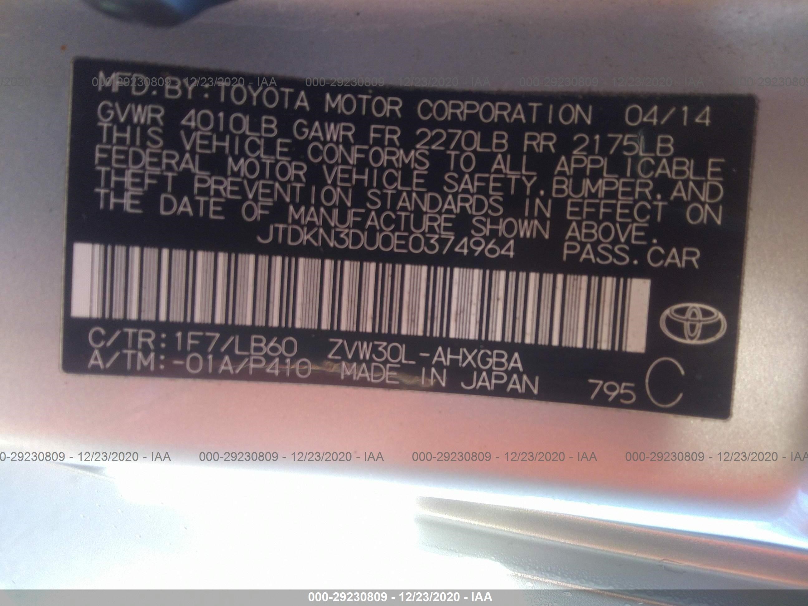 VIN: JTDKN3DU0E0374964
