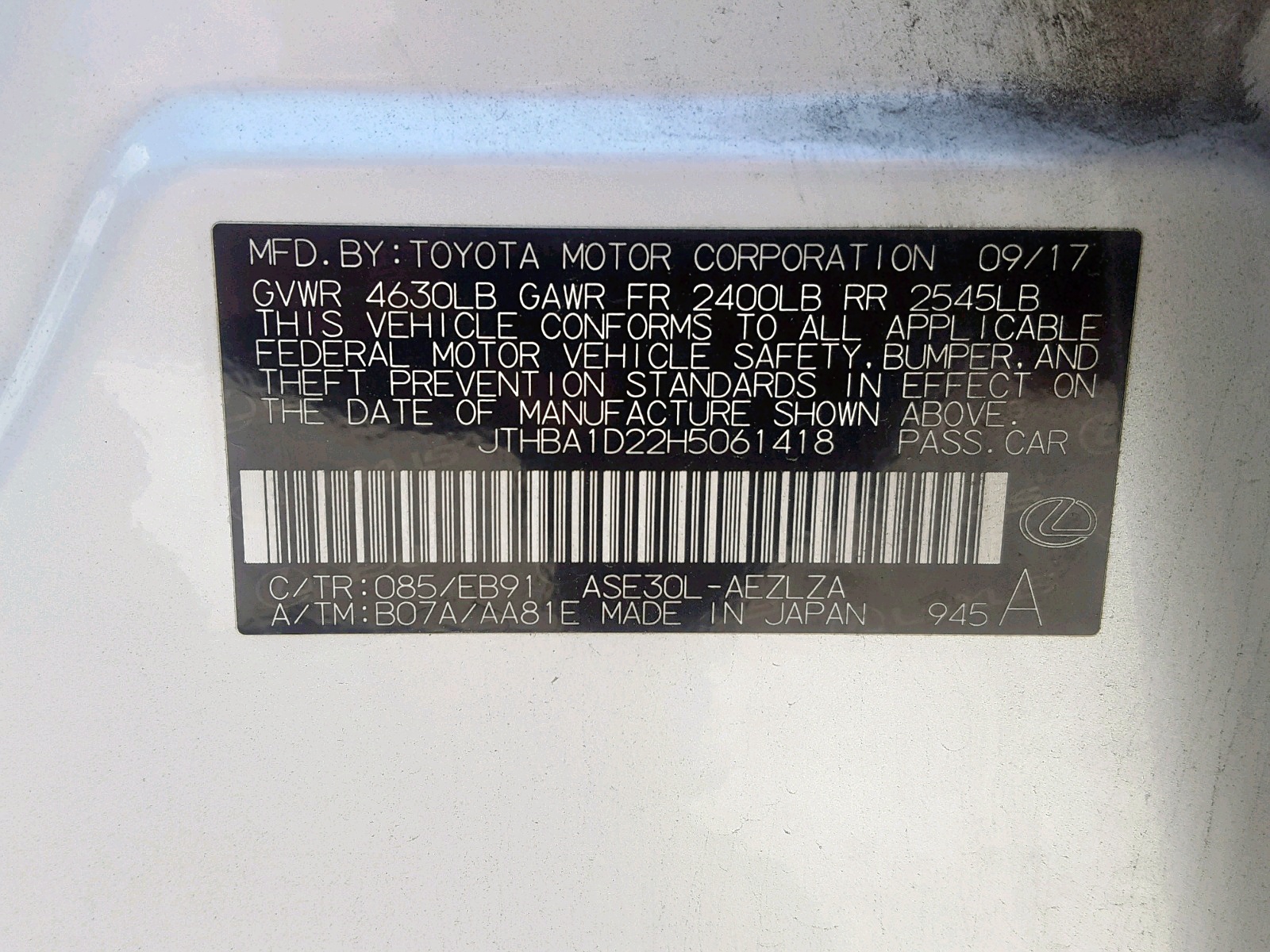 VIN: JTHBA1D22H5061418