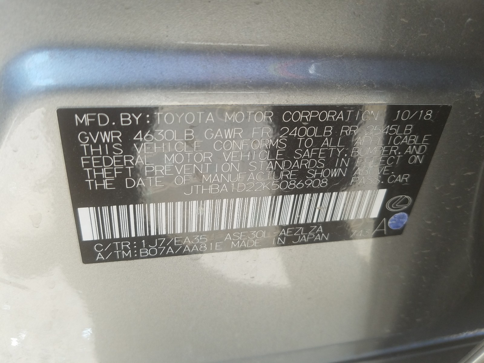 VIN: JTHBA1D22K5086908