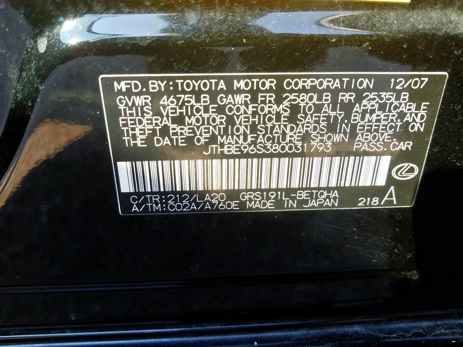 VIN: JTHBE96S380031793