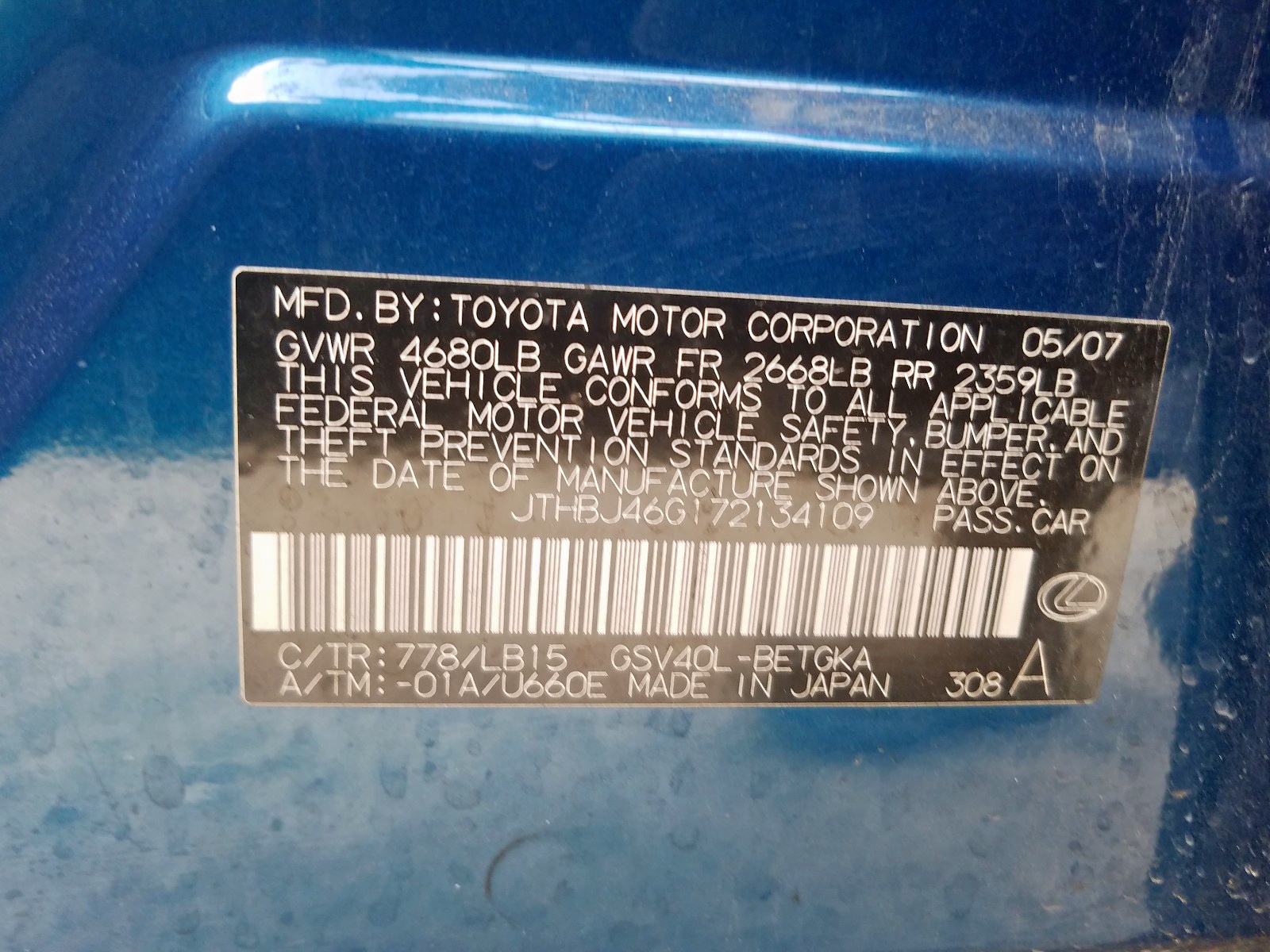 VIN: JTHBJ46G172134109