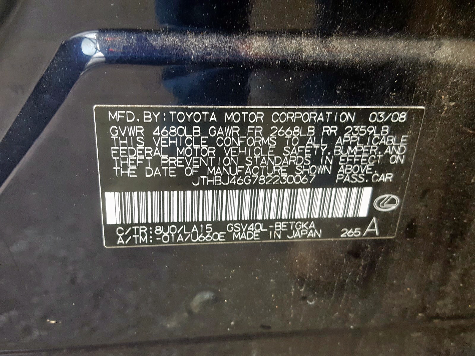 VIN: JTHBJ46G782230067
