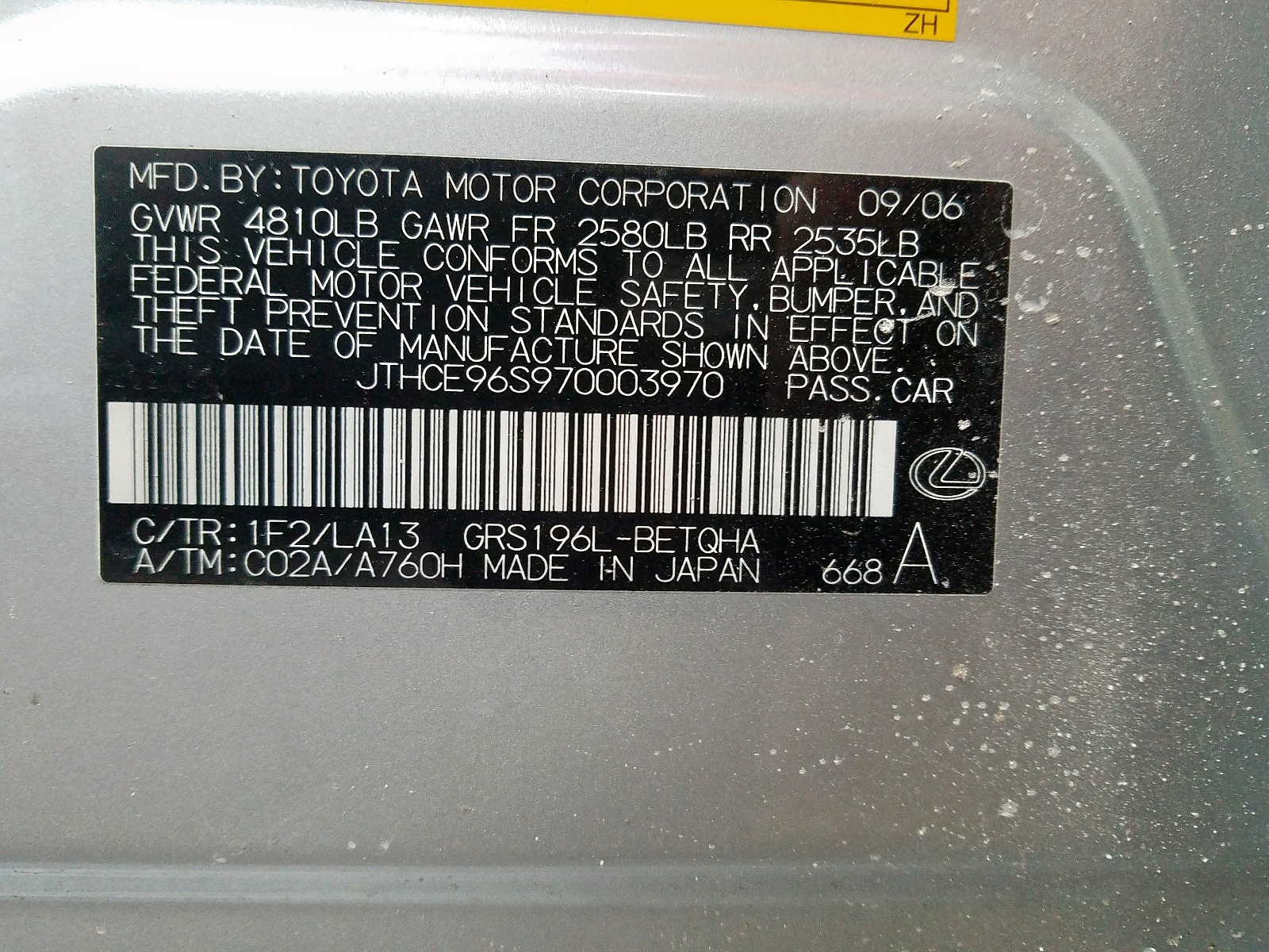 VIN: JTHCE96S970003970