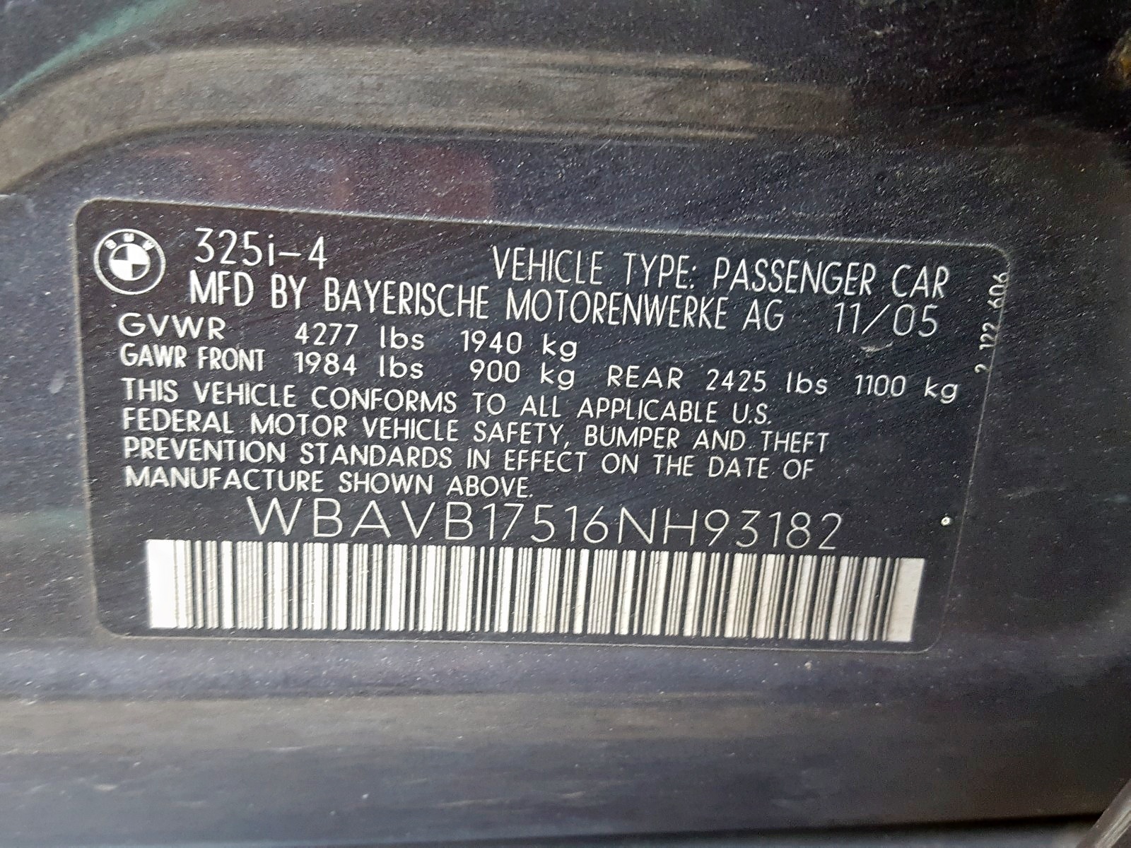 VIN: WBAVB17516NH93182